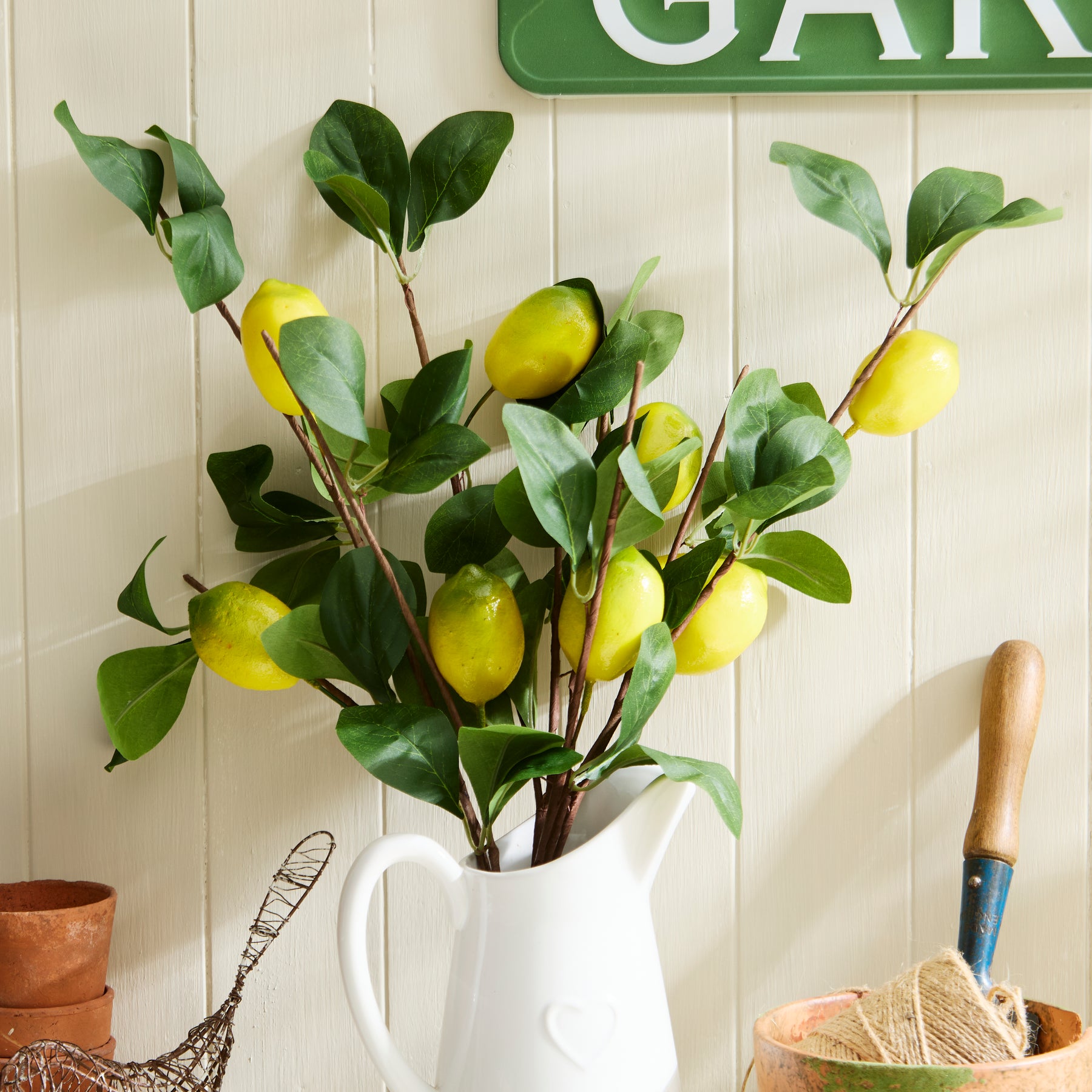 Bring a touch of Mediterranean freshness to your décor with this set of three 55cm artificial lemon sprays. Each spray features lifelike yellow lemons, lush green leaves, and delicate white blossoms for a beautifully natural look. Perfect for creating fuller floral arrangements, brightening kitchen displays, or adding a cheerful summer touch to your home—all without any maintenance.