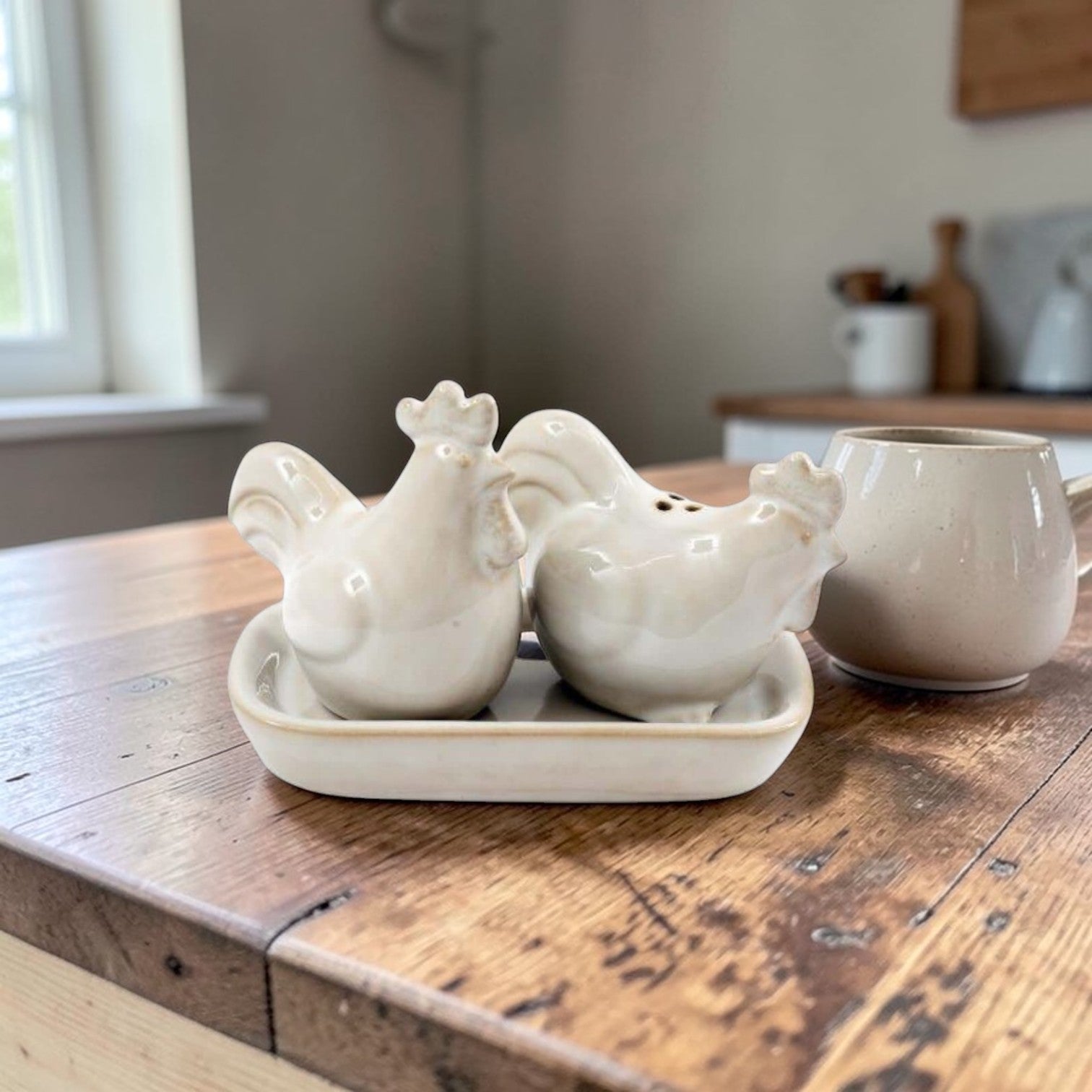 This brocante chicken cruet set features two decorative chicken-shaped pots designed for salt and pepper, presented neatly on a matching tray. Made from stoneware with a soft neutral finish, the set has a classic farmhouse and country kitchen style. The chicken design adds a charming decorative touch while remaining practical for everyday table use.