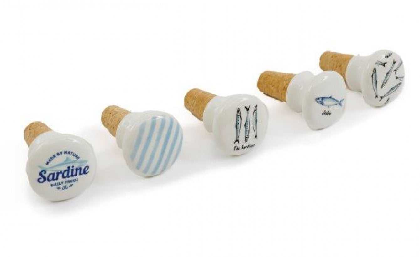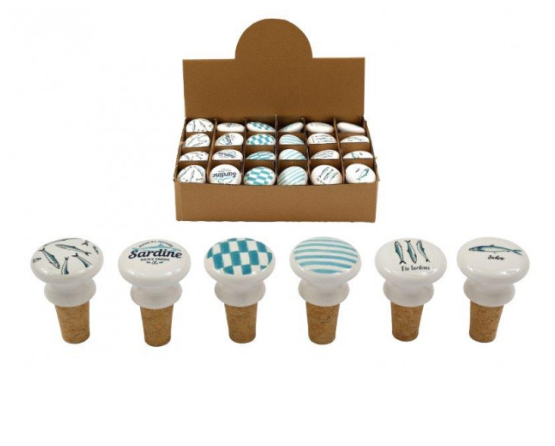 Add a playful coastal touch to your kitchen or dining table with these ceramic and cork bottle stoppers, each featuring a unique sardine-themed design. Ideal for sealing wine, oil, or vinegar bottles in nautical style. Assorted designs, sold individually.