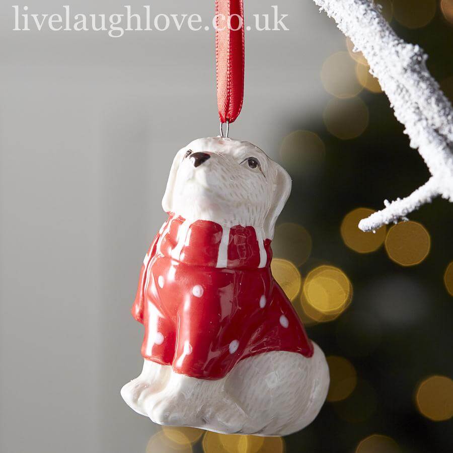 A cute ceramic doggie decoration with a festive hat, jumper and a scarf. This festive piece has been handpainted in a red and white colourways and is hung from a red ribbon.
