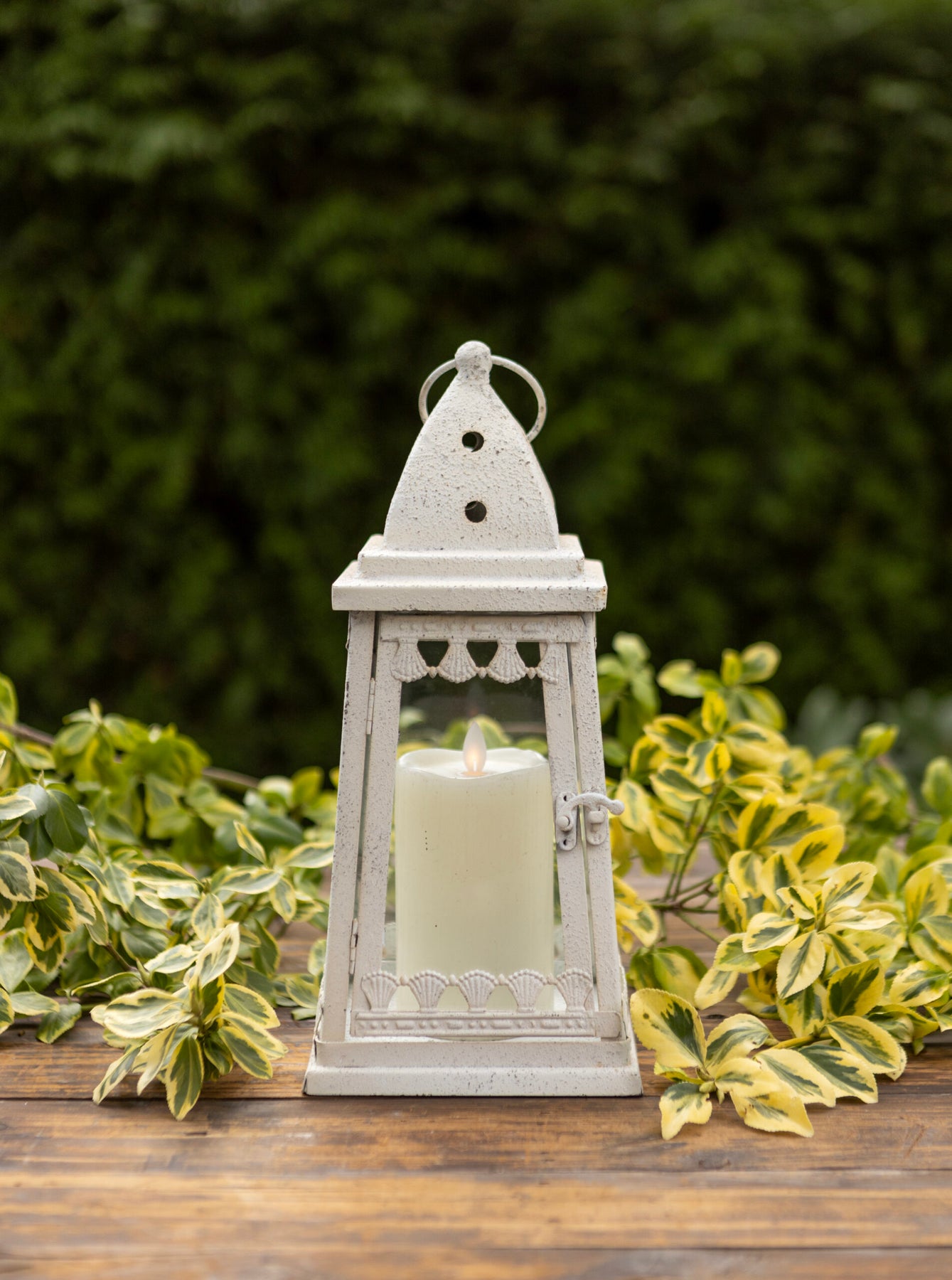 Add soft, atmospheric lighting to your home or garden with this cream metal decorative lantern. Finished in a lightly distressed neutral tone, it features clear glass panels and delicate detailing that beautifully showcase a pillar candle or LED alternative. The hinged door allows easy access, while the top ring offers the option to hang or display as a freestanding piece. Candle not included. Ideal for patios, shelves, hallways or table styling, this lantern adds elegant charm to both indoor and sheltered outdoor spaces.