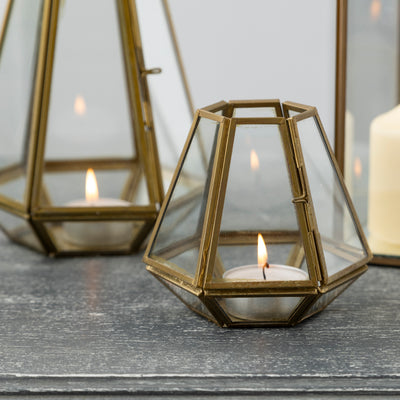 Add a touch of sophistication to your home with these stunning mirror and glass lanterns. Perfect for both indoor and outdoor settings, they bring a warm glow and chic style to any space. Available in two unique sizes and styles, these lanterns feature a brass-tone frame and geometric design, creating a timeless, elegant look. Whether for a cozy evening or a centerpiece display, these lanterns are perfect for creating a serene ambiance in your living area or garden. Ideal for use with pillar candles.