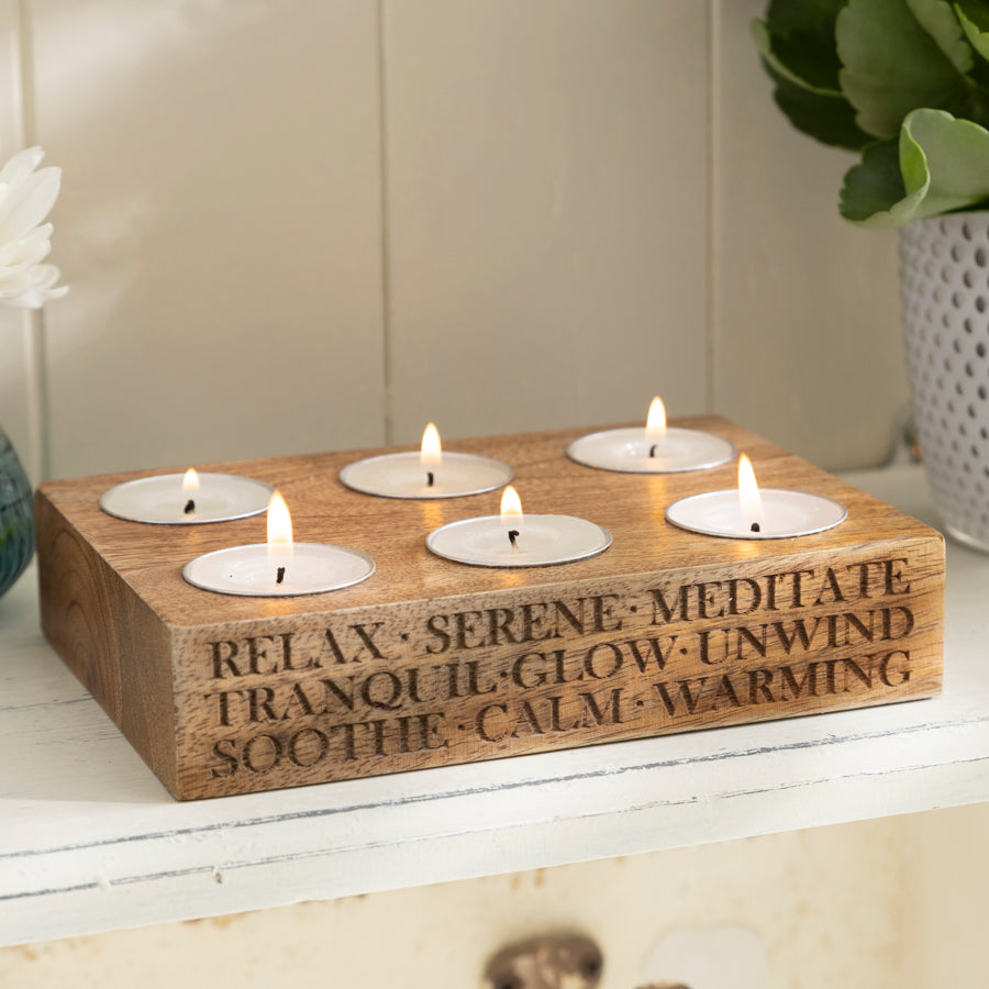 Enhance your space with this set of Engraved Wooden Tealight Candle Holders, available in two heartfelt variants. Choose between "Live Laugh Love" or "Relax, Serene, Meditate..." to suit your mood or decor. Each holder, crafted from mango wood, holds six tealights, which are included to instantly create a warm, inviting ambiance. Perfect for relaxation spaces, living rooms, or as a meaningful gift, these candle holders add both charm and tranquility to any environment.