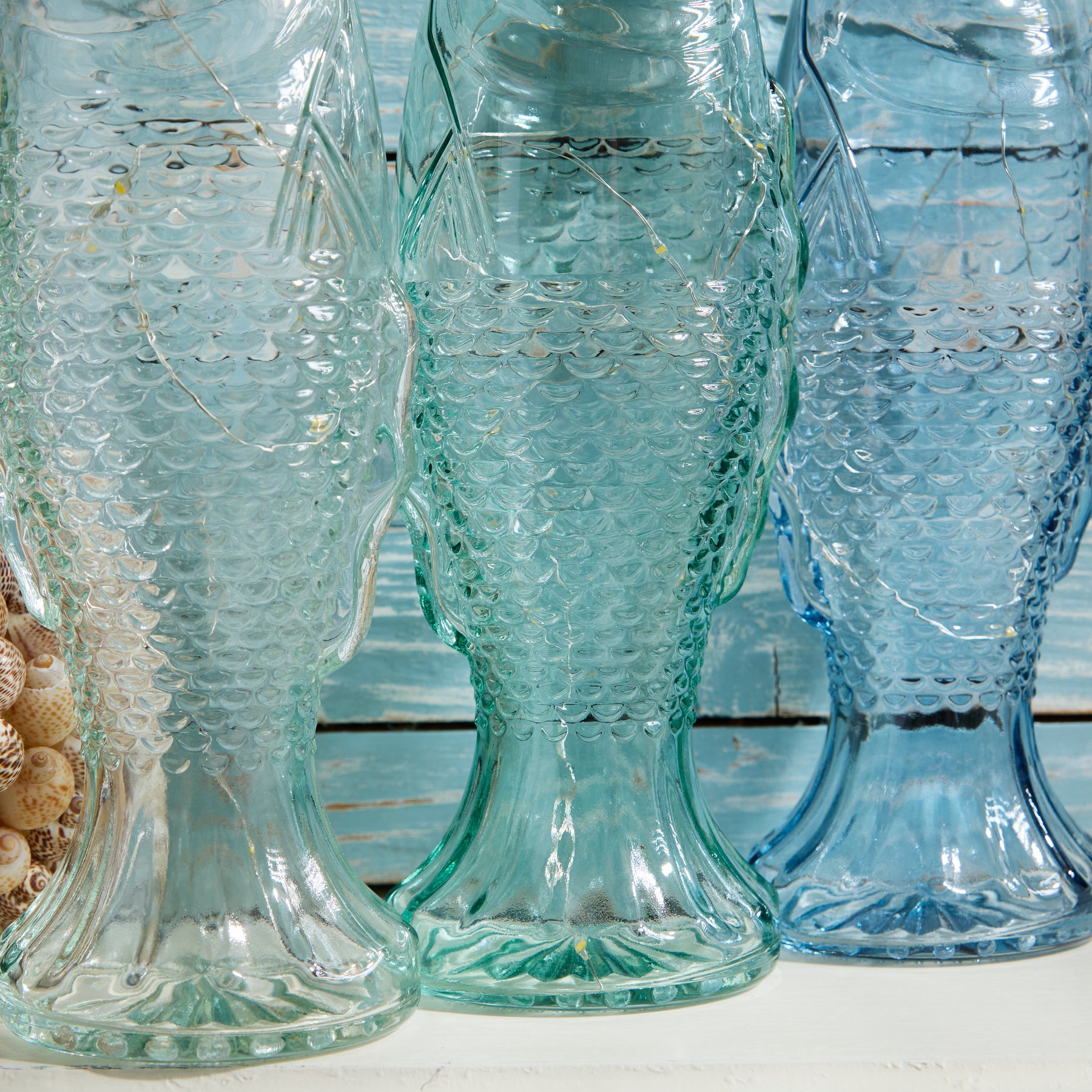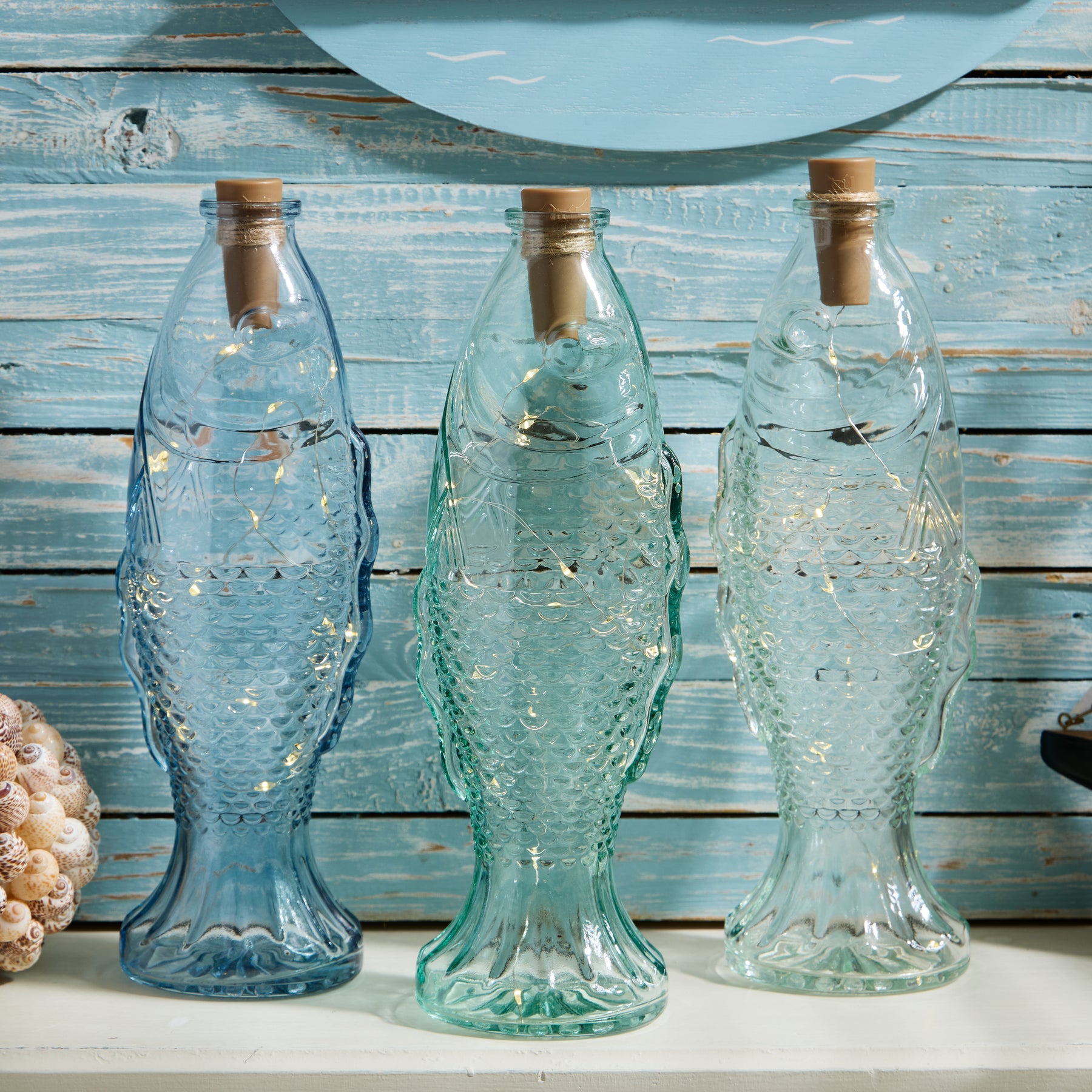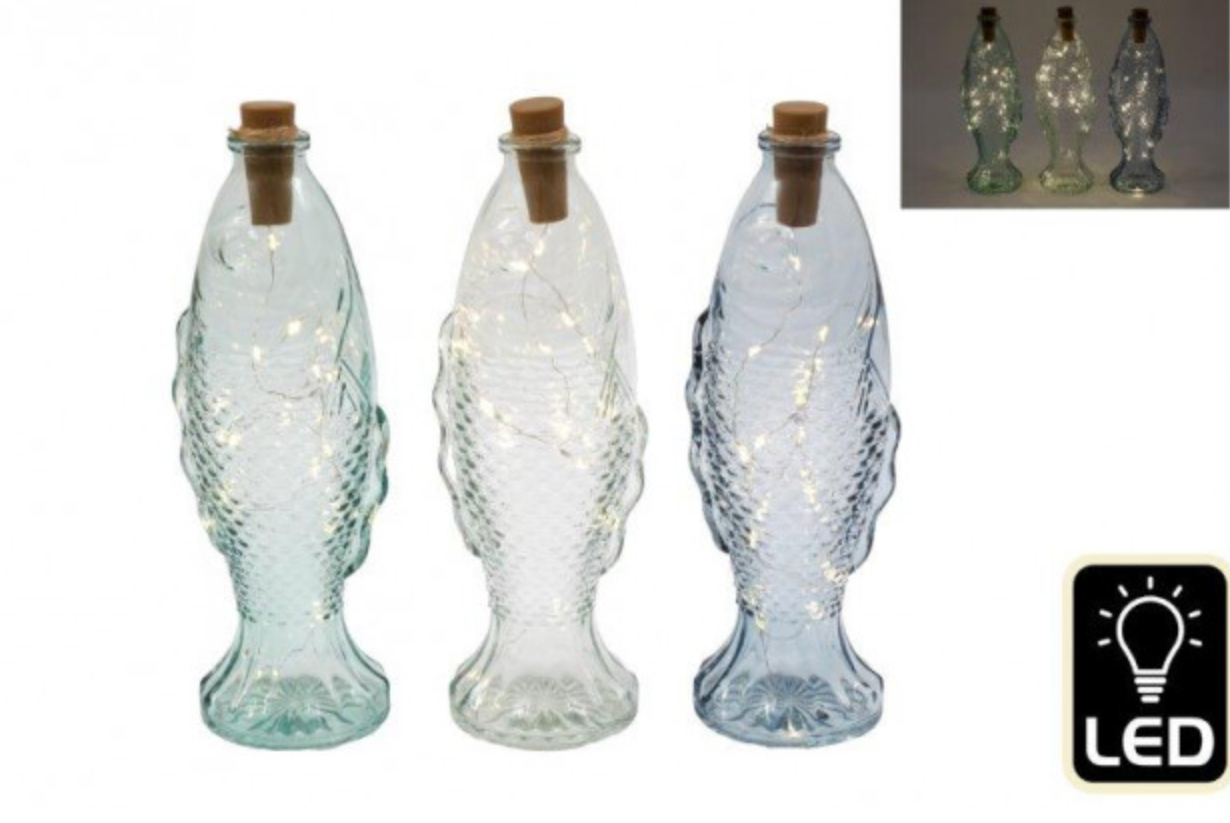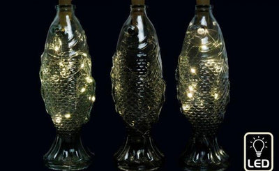 Create a cosy coastal glow with this fish-shaped glass bottle light, featuring warm white LED micro lights inside and a natural cork stopper. Perfect for nautical-themed décor, shelf styling, or ambient lighting. Battery-operated and sold individually in assorted glass tones.