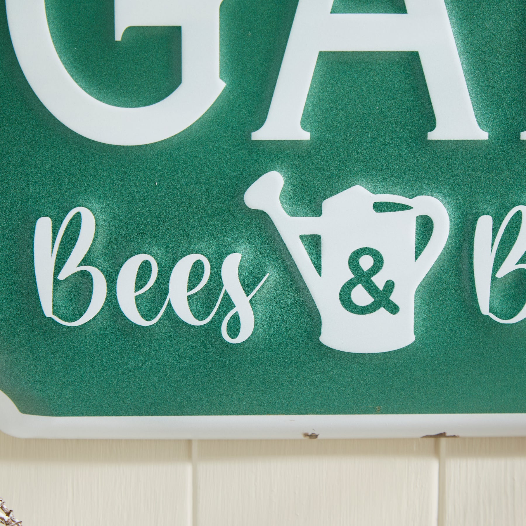 Create a nature-friendly vibe in your outdoor space with this charming green metal garden sign featuring the phrase "Garden – Bees & Butterflies Welcome." With a soft distressed finish and elegant white lettering, this rustic-style plaque is perfect for garden walls, fences, sheds, or patios. Made from sturdy metal with a lightly weathered look, it brings a whimsical and welcoming touch to any wildlife-friendly garden. A lovely gift idea for gardeners and nature lovers alike.