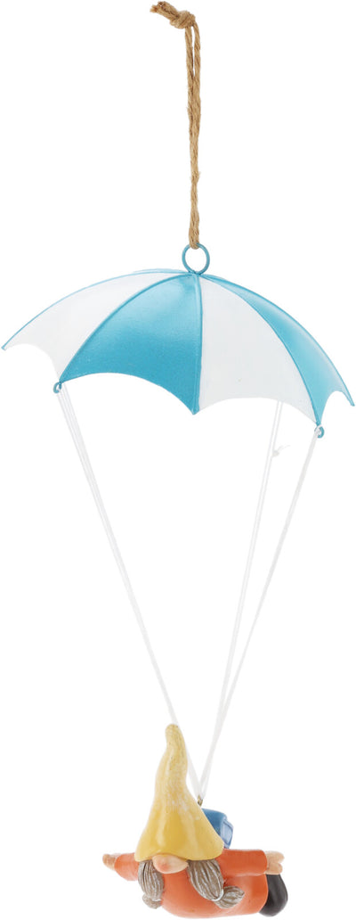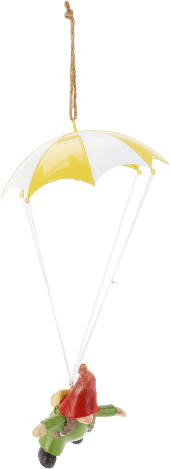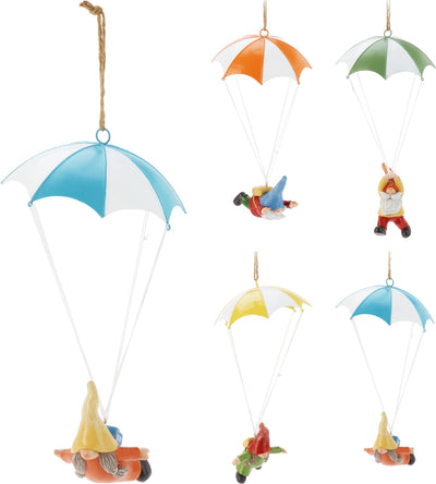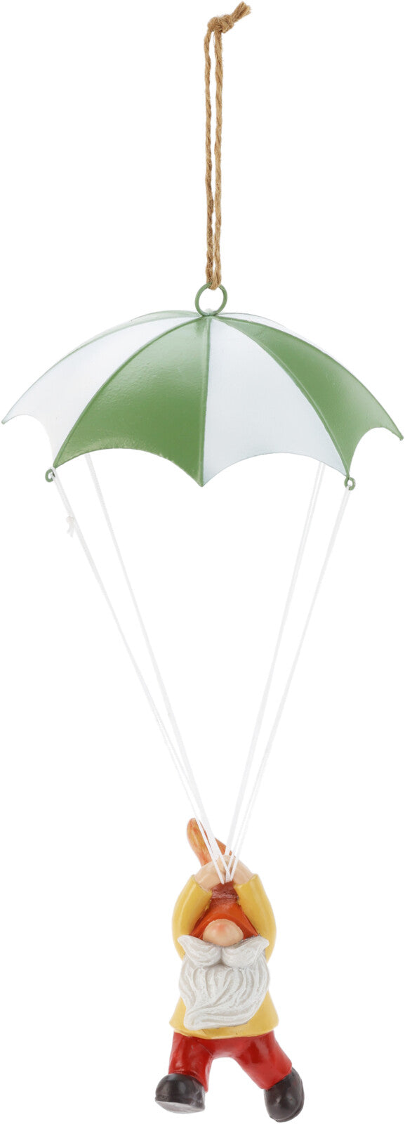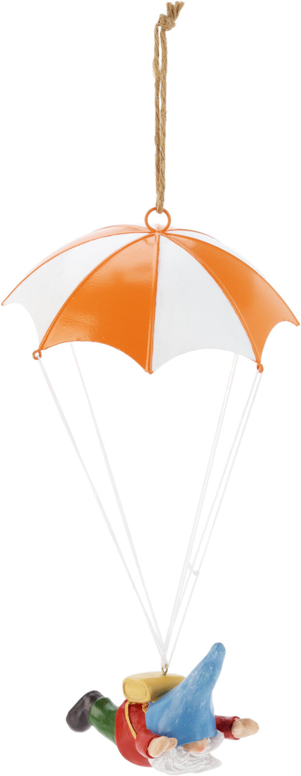 This hanging gnome parachute decoration is a fun and quirky addition to both indoor and outdoor spaces. Made from durable resin and metal, each gnome hangs from a colourful parachute with a rustic jute hanging rope for easy display. Ideal for adding character to gardens, balconies, patios or even indoor areas like conservatories and porches, these gnomes bring a touch of humour and charm wherever they’re placed. Their weather-resistant materials make them suitable for hanging from tree branches, garden hooks, pergolas or indoor ceiling hooks. Approximate total height is 34cm. Each gnome parachute decoration is sold individually.