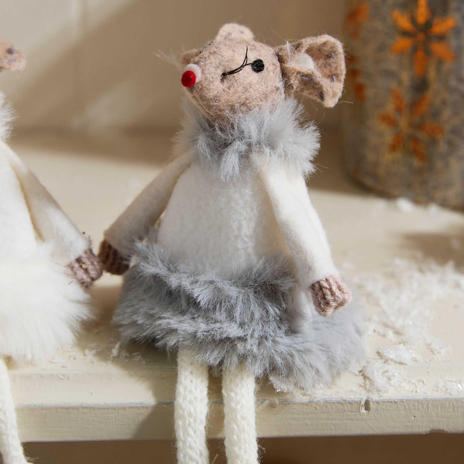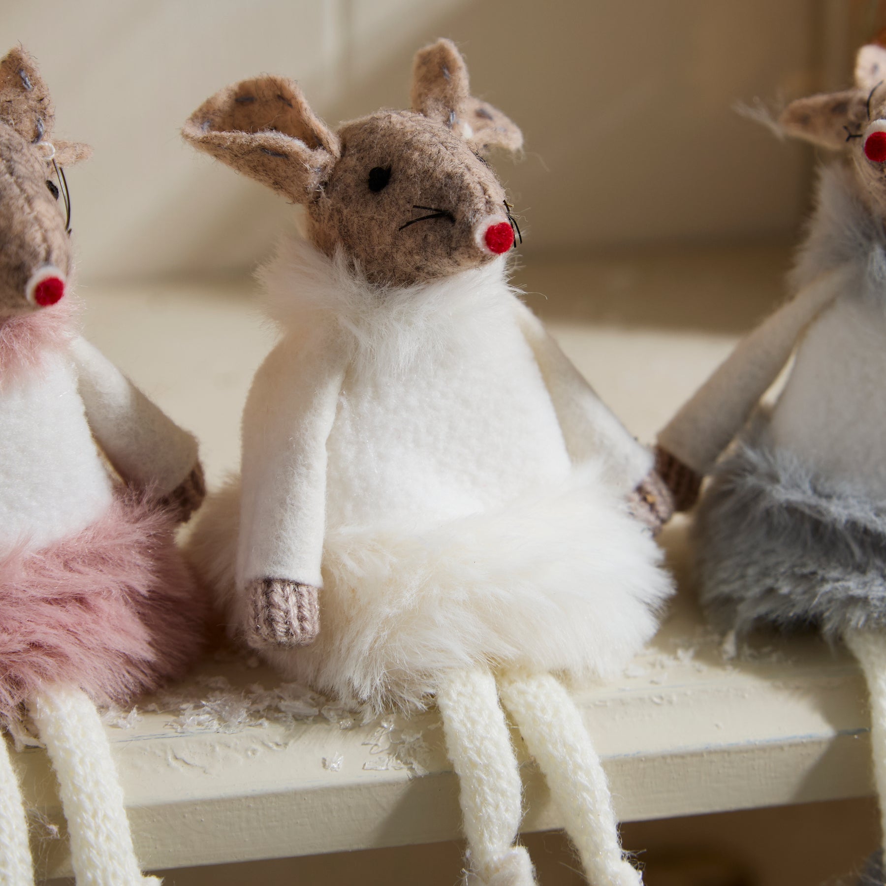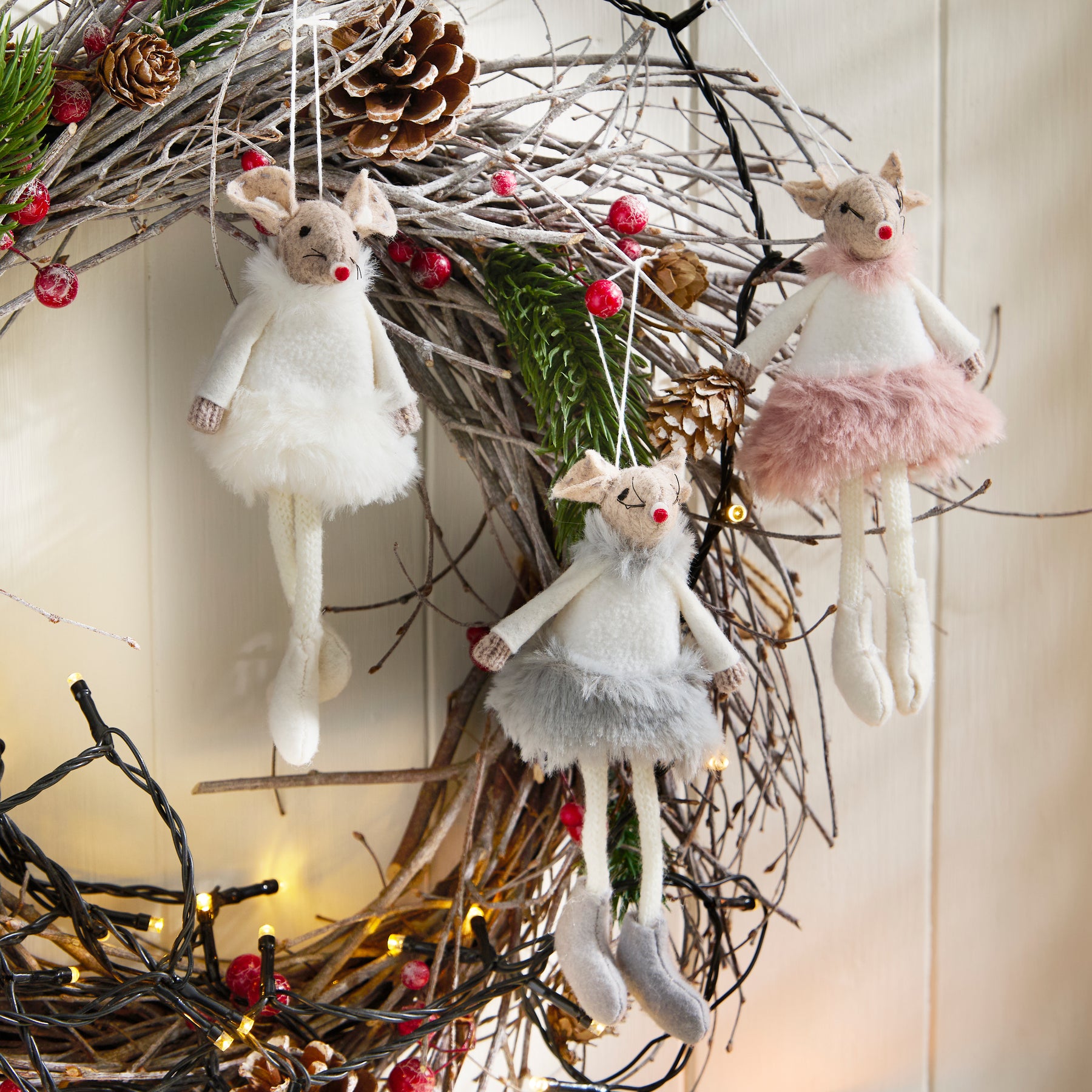 Add charm to your festive décor with these delightful Hanging Mouse Ballerina Decorations. Each mouse features a sweet red nose, fluffy skirt, and cozy winter details, making them an enchanting addition to your Christmas tree or seasonal display. Available individually or as a set of three for a coordinated look.