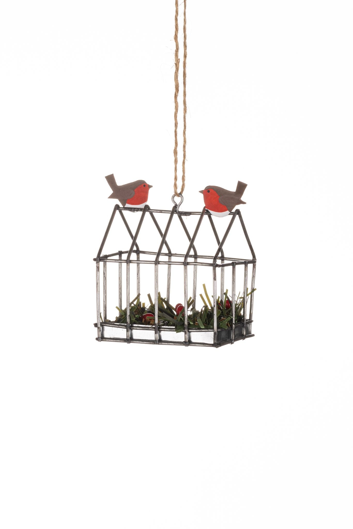Add festive charm to your home with this hanging robin greenhouse decoration. Featuring two red-breasted robins perched on a metal-frame greenhouse with faux greenery and berries inside. Perfect for Christmas tree decorating or as a winter-themed ornament.