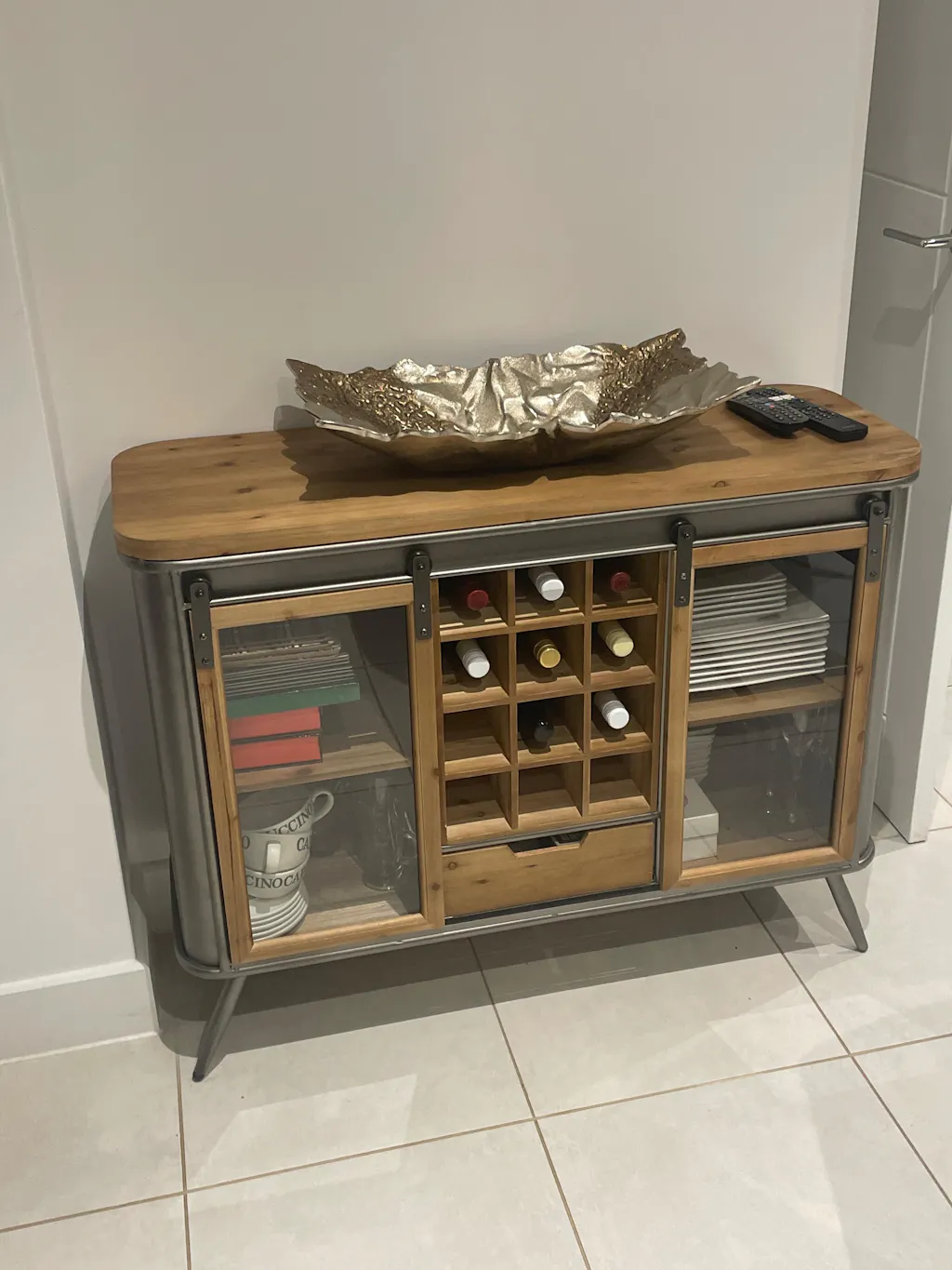 Industrial Rustic Wood and Metal Wine Cabinet with Sliding Glass Doors