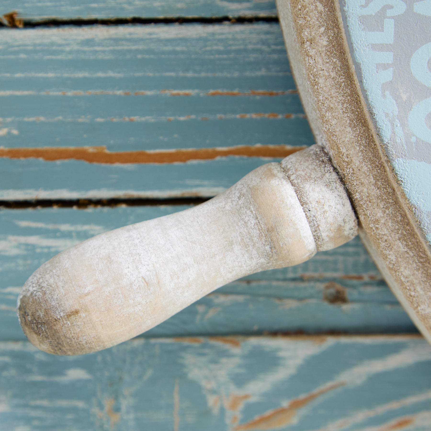 Add a coastal touch to your home with this decorative nautical ship wheel wall decor. Finished in white with blue accents, rope detailing, and seaside wording, it's perfect for beach house, bathroom, or nautical-themed interiors.