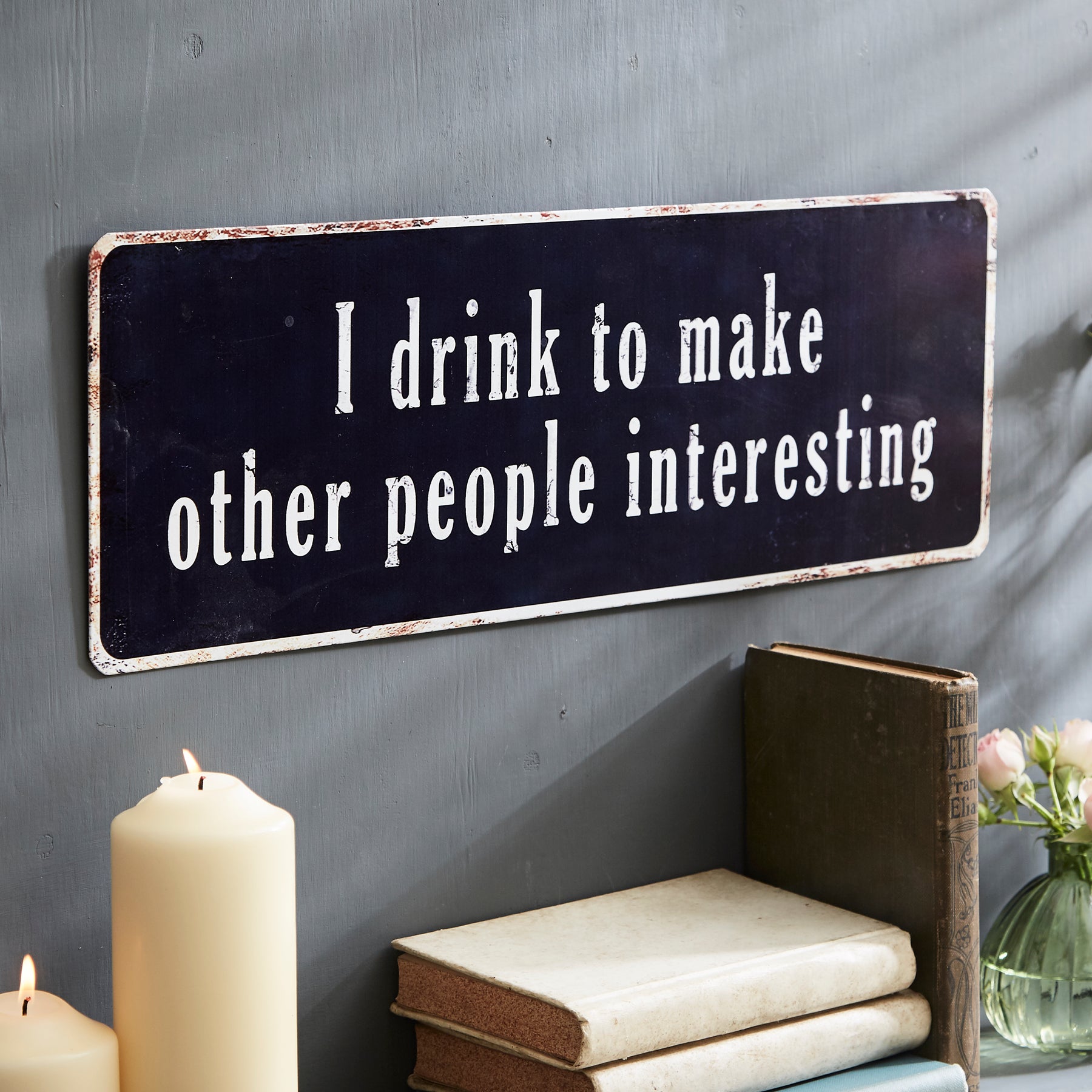 Add a splash of humour to your home with this witty vintage-style plaque. Featuring the cheeky phrase “I drink to make other people interesting”, this metal wall sign is perfect for bringing a smile to your kitchen, dining room, bar area, or man cave. With its distressed finish and rustic charm, it’s a great conversation starter and a stylish way to inject personality into your décor.