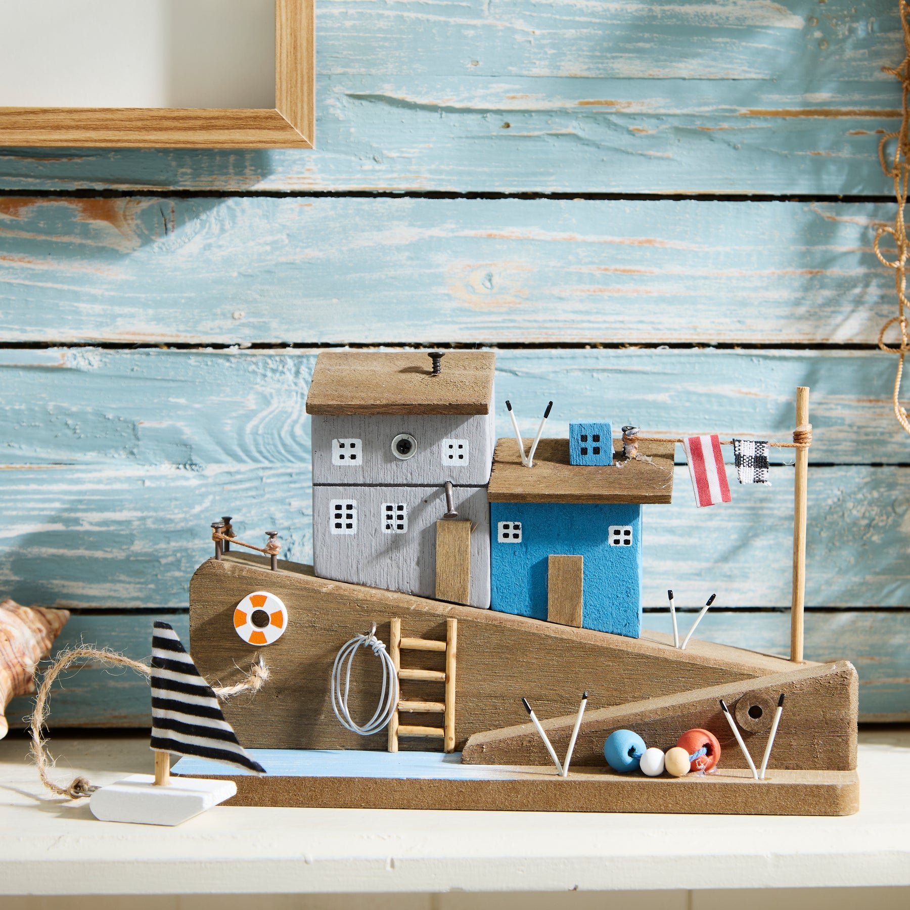 This Nautical Seashore Cottages with Quayside Theme decor piece brings the serene charm of a coastal village to your living space. Crafted from wood with a deliberately distressed finish, it authentically captures the rustic beauty of seaside life. The scene is intricately detailed with quaint houses, flying seagulls, a rope-tethered boat, and a quayside ramp, creating a picturesque display that evokes the tranquil and bustling activity of a harbor. This piece’s rustic charm and nautical theme make it an ideal addition for those looking to infuse their home with the calming essence of the sea. Whether it’s placed on a mantle, shelf, or as a centerpiece, it's sure to bring a touch of coastal allure and warmth to any room, making it a perfect gift for sea lovers or a delightful accent in your own coastal-inspired decor.