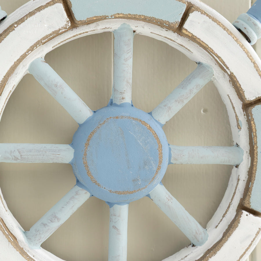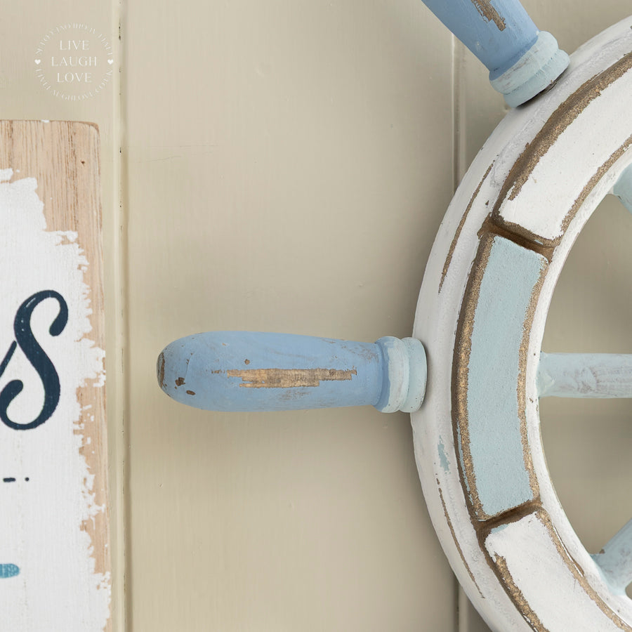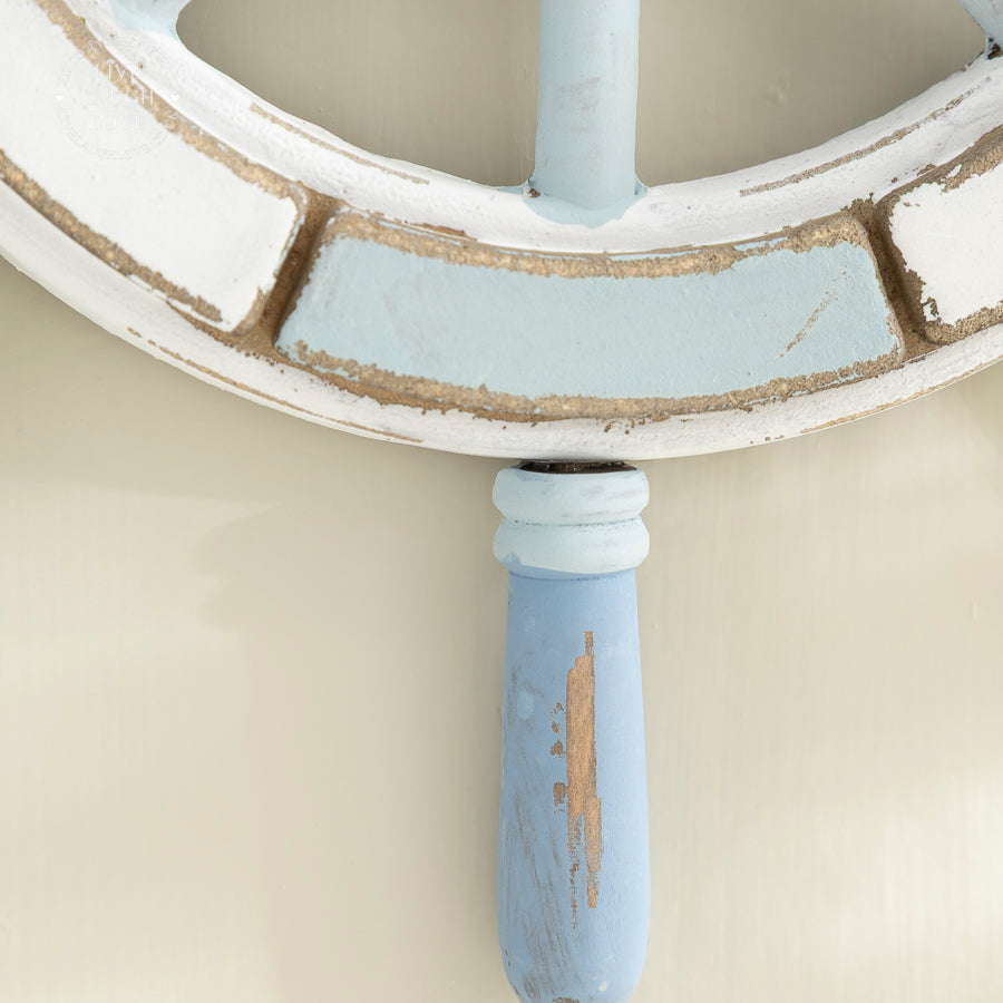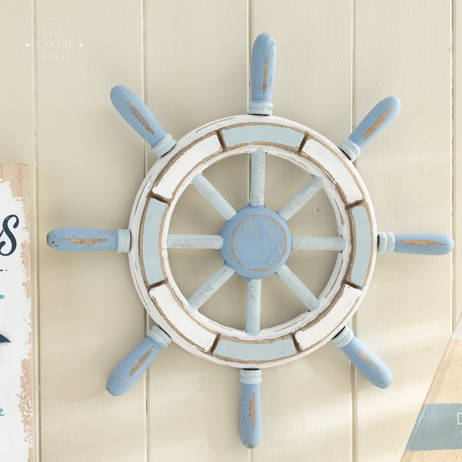 Steer your home décor in the right direction with this Nautical Wooden Ship’s Wheel. Finished in distressed light blue and white, this decorative ship’s wheel evokes the charm of the open sea. Ideal for creating a coastal ambiance, this piece is perfect for beach houses, bathrooms, or any space that needs a touch of maritime flair.