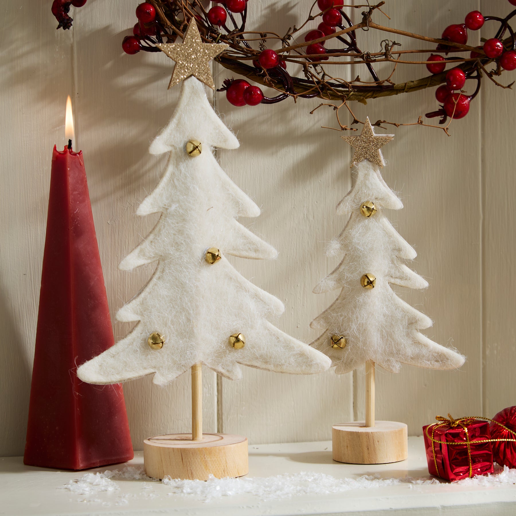 Add a touch of warmth to your festive décor with this charming pair of felt Christmas trees. Featuring soft white felt, golden bell details, and glittering stars, these tabletop decorations bring a cosy, Scandinavian-inspired charm to your home. Perfect for mantels, shelves, or festive displays.