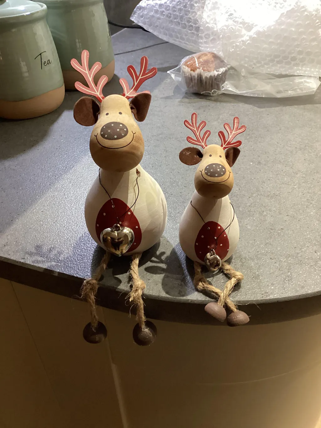 Bring festive cheer to your home with this adorable sitting reindeer figurine, featuring charming wooden head, rope legs, and painted white body with silver heart pendant. Perfect for shelves, mantelpieces, or Christmas displays, these rustic reindeer add a warm and whimsical touch to your seasonal décor.