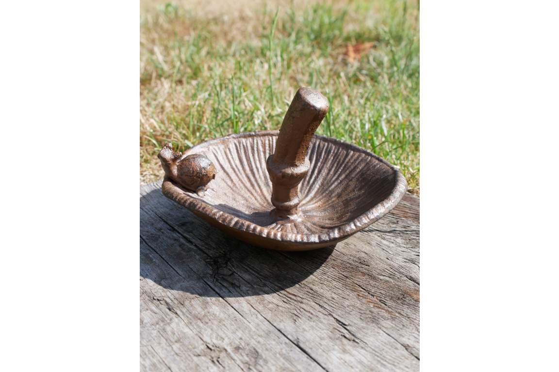 Add vintage charm to your outdoor space with this rustic metal bird feeder bowl, featuring a decorative snail perched on the rim. Crafted from sturdy metal with a naturally aged rust finish, it offers a timeless, weathered look that blends beautifully into garden settings. Perfect for patios, lawns, and flower beds, this durable feeder provides a practical feeding spot while doubling as a characterful garden ornament.