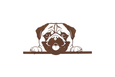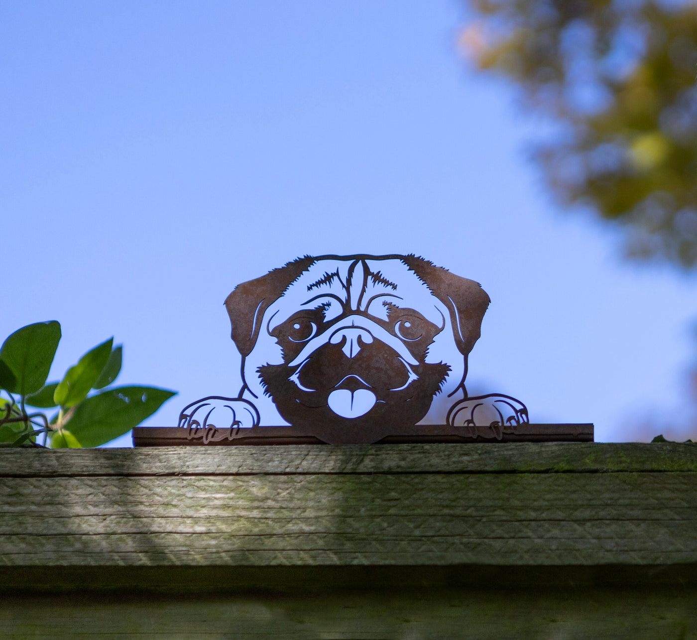 Add personality to your space with this adorable rustic metal pug ornament. Featuring a playful design of a pug peeking over an edge, this versatile piece can be used as garden decor, a fence topper, or unique wall art, making it a delightful addition to any setting.
