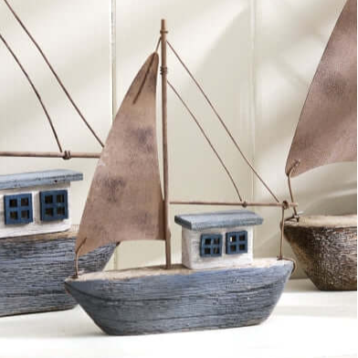 Bring a touch of seaside charm to your home with this wooden sailboat ornament. Featuring rustic blue and white tones with metal sail and charming cabin detail, this decorative boat is perfect for adding a nautical feel to shelves, mantelpieces, or windowsills. Ideal for coastal-inspired interiors, beach-themed rooms, or as a thoughtful gift for sailing enthusiasts.