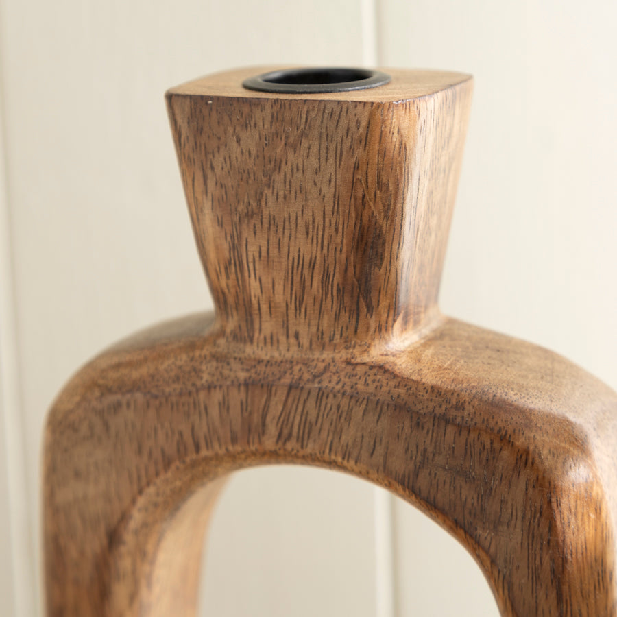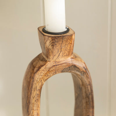 Add a touch of modern rustic charm to your decor with this beautifully crafted wooden candle holder. Featuring a unique open frame design, this piece blends contemporary style with the warmth of natural wood. Its sturdy base and clean lines make it a versatile addition to any space, perfect for holding your favorite taper candles. Ideal for mantel displays, dining tables, or as a standout accent, this candle holder brings a cozy and stylish element to your home.