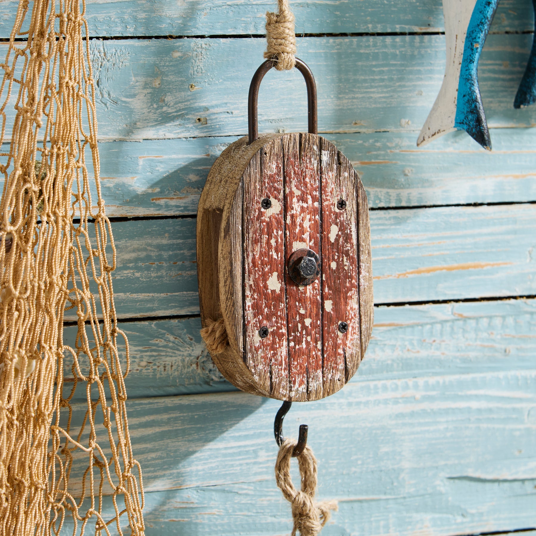 Add vintage nautical charm to your home with this rustic wooden pulley hook. Featuring a distressed finish, sturdy metal hook, and rope detail, it’s perfect for hanging coats, bags, or decorative accents in coastal and industrial-style interiors.