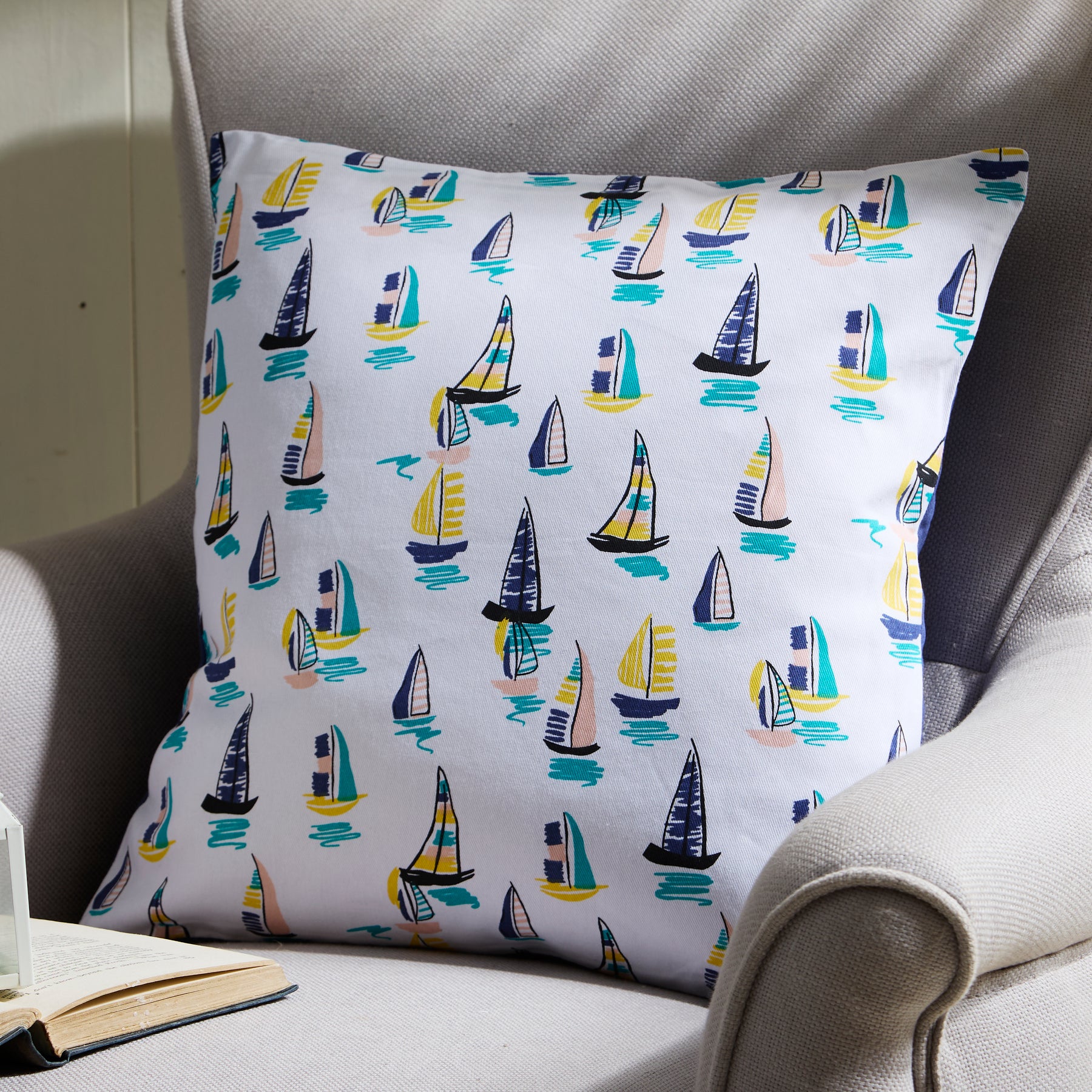 Sailing Boats Cushion – Nautical White Pillow with Colourful Yachts
