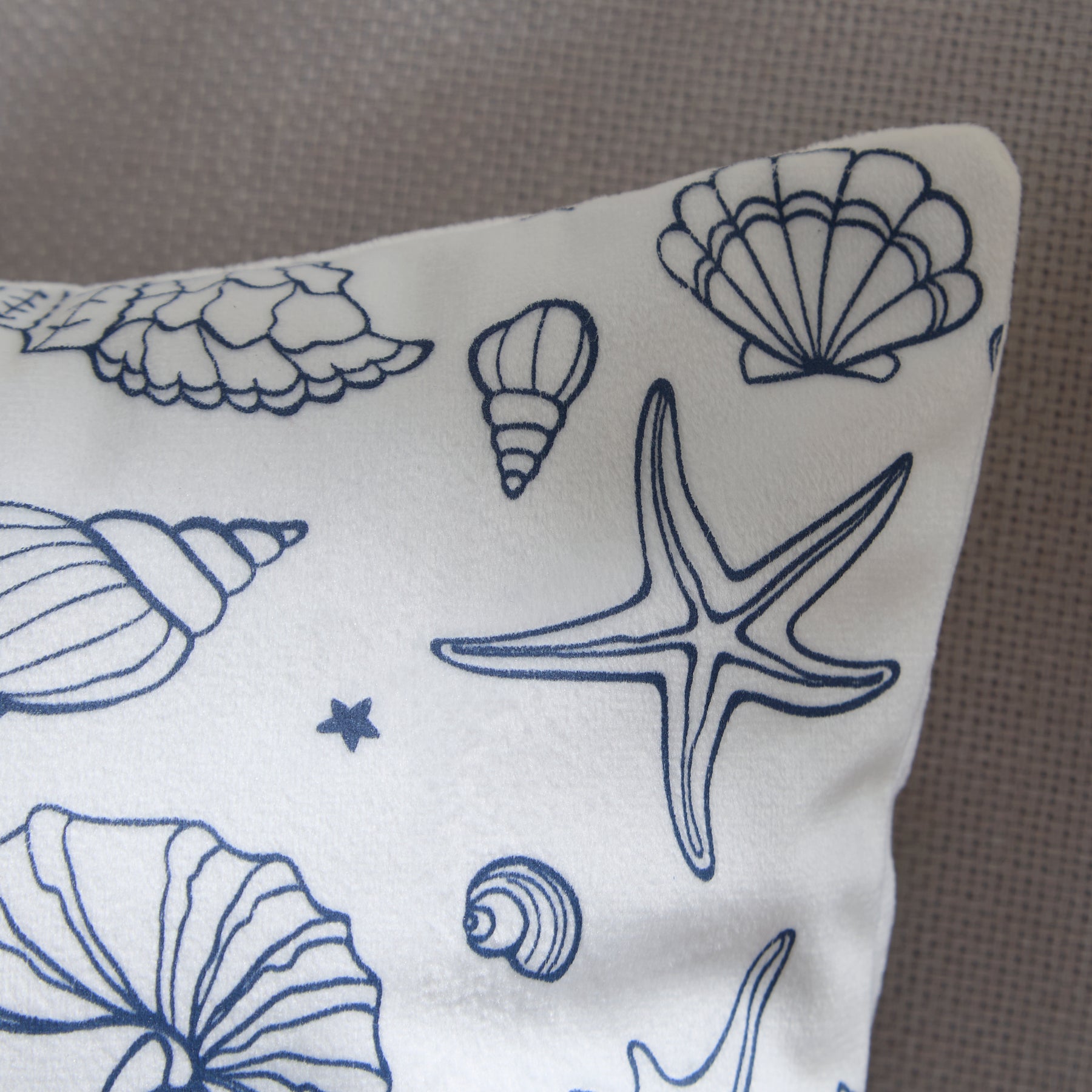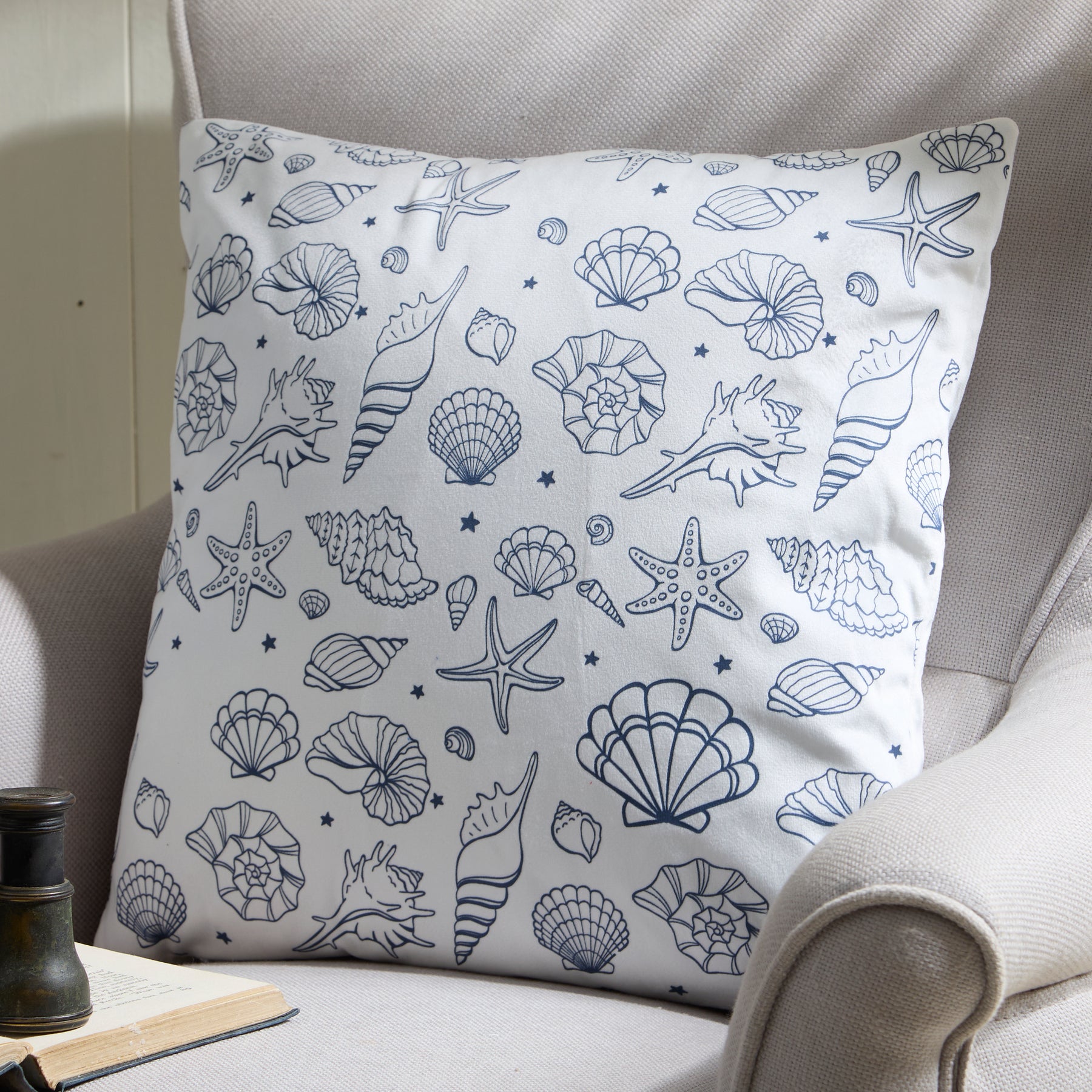 Embrace seaside serenity with this white cushion printed with outlined seashells, starfish, and marine treasures in navy. A lovely coastal accent for beach houses or nautical-themed interiors.