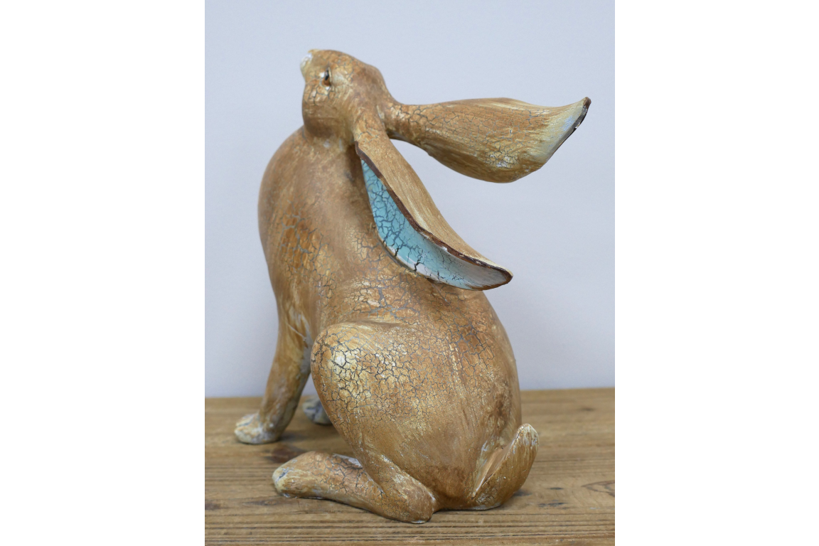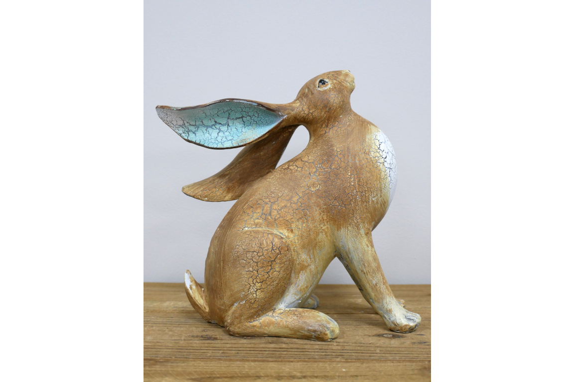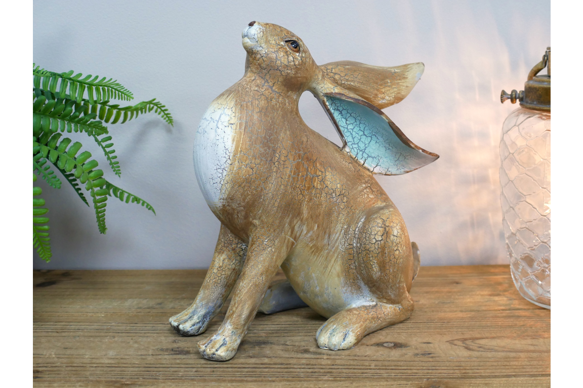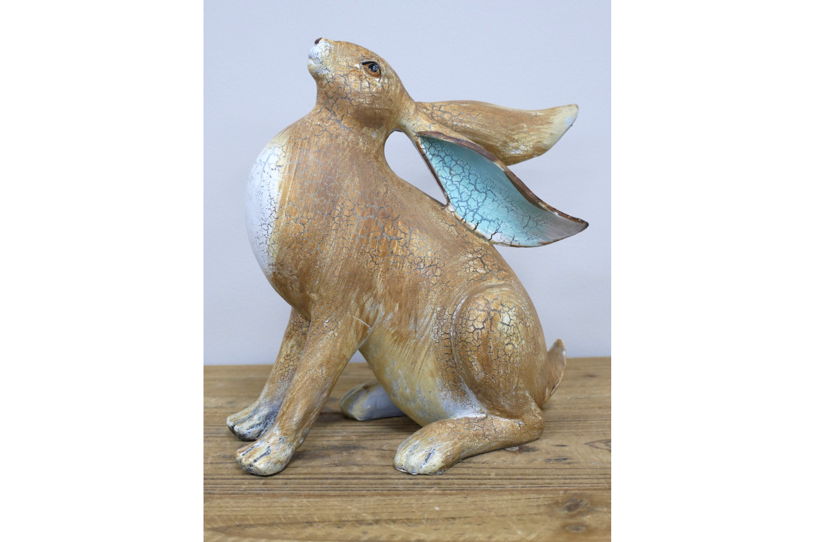 This decorative hare ornament is made from resin and features a seated design with an uplifted head and long swept-back ears. The natural brown finish, white chest detail, and pale blue colouring inside the ears give it a distinctive look that suits rustic, country, and nature-inspired interiors. Its lower, wider shape makes it ideal for styling on shelves, sideboards, console tables, or mantel displays.