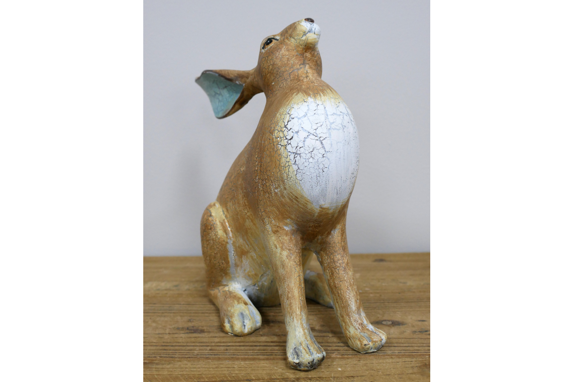 This resin hare ornament is a simple way to add a decorative nature-inspired touch to the home. Its expressive pose and detailed finish make it well suited to display on its own or alongside other ornaments and accessories. It works especially well in living spaces, hallways, bedrooms, or seasonal spring displays where a rustic or country look is wanted.