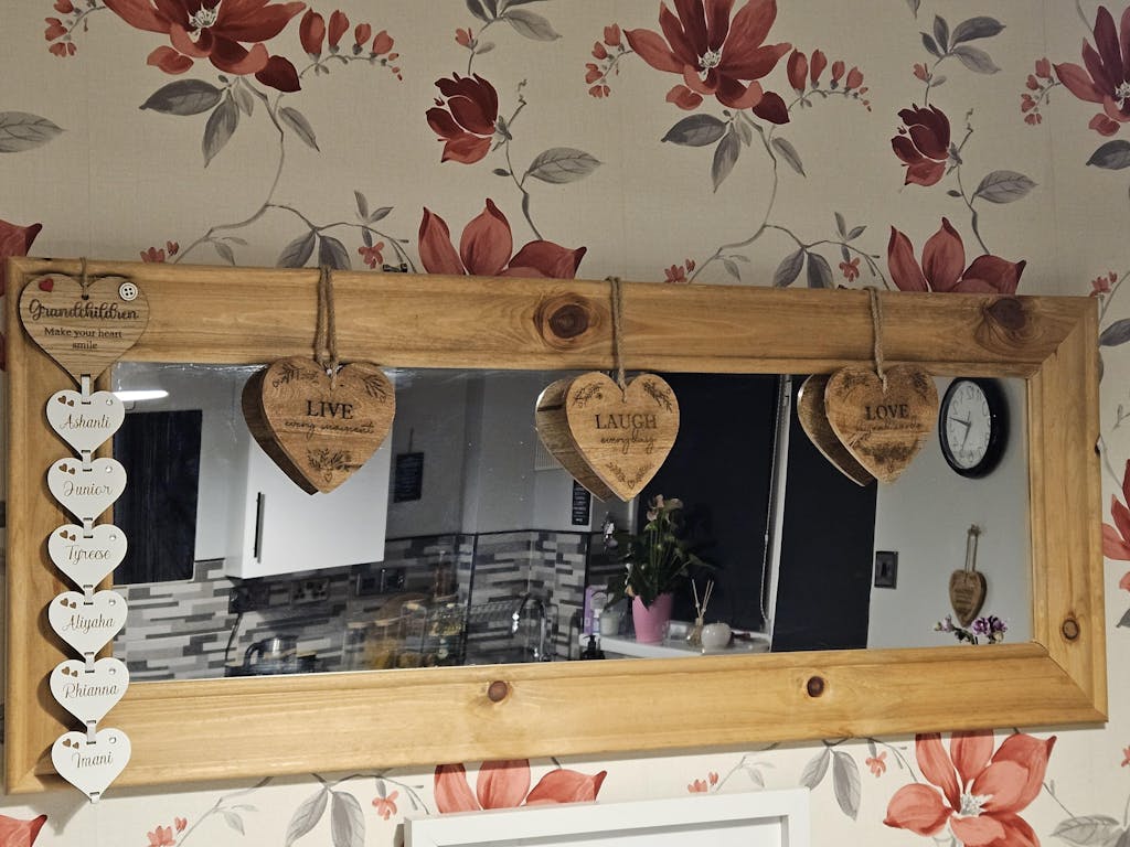 Infuse your home with warmth and positivity with this set of 3 Engraved Wooden Heart Hanging Plaques. Each plaque is lovingly engraved with one of the timeless sentiments: "Live every moment," "Laugh every day," and "Love beyond words." These rustic heart-shaped plaques feature intricate floral designs, enhancing their natural beauty. Perfect for hanging together or individually, they add a heartfelt touch to any room. Ideal as a gift for loved ones or as an inspiring addition to your own décor, these plaques are sure to uplift and inspire.