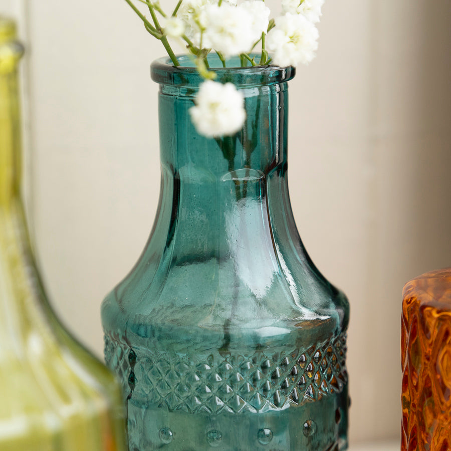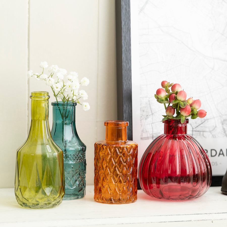 Brighten up your home with this vibrant set of 4 Colorful Glass Bud Vases. Each vase features a unique shape and textured design in bold shades of orange, pink, teal, and yellow. Perfect for displaying single blooms or small floral arrangements, these miniature vases add a playful pop of colour to any space. Whether placed together or scattered throughout a room, they are ideal for creating a fun and lively atmosphere.