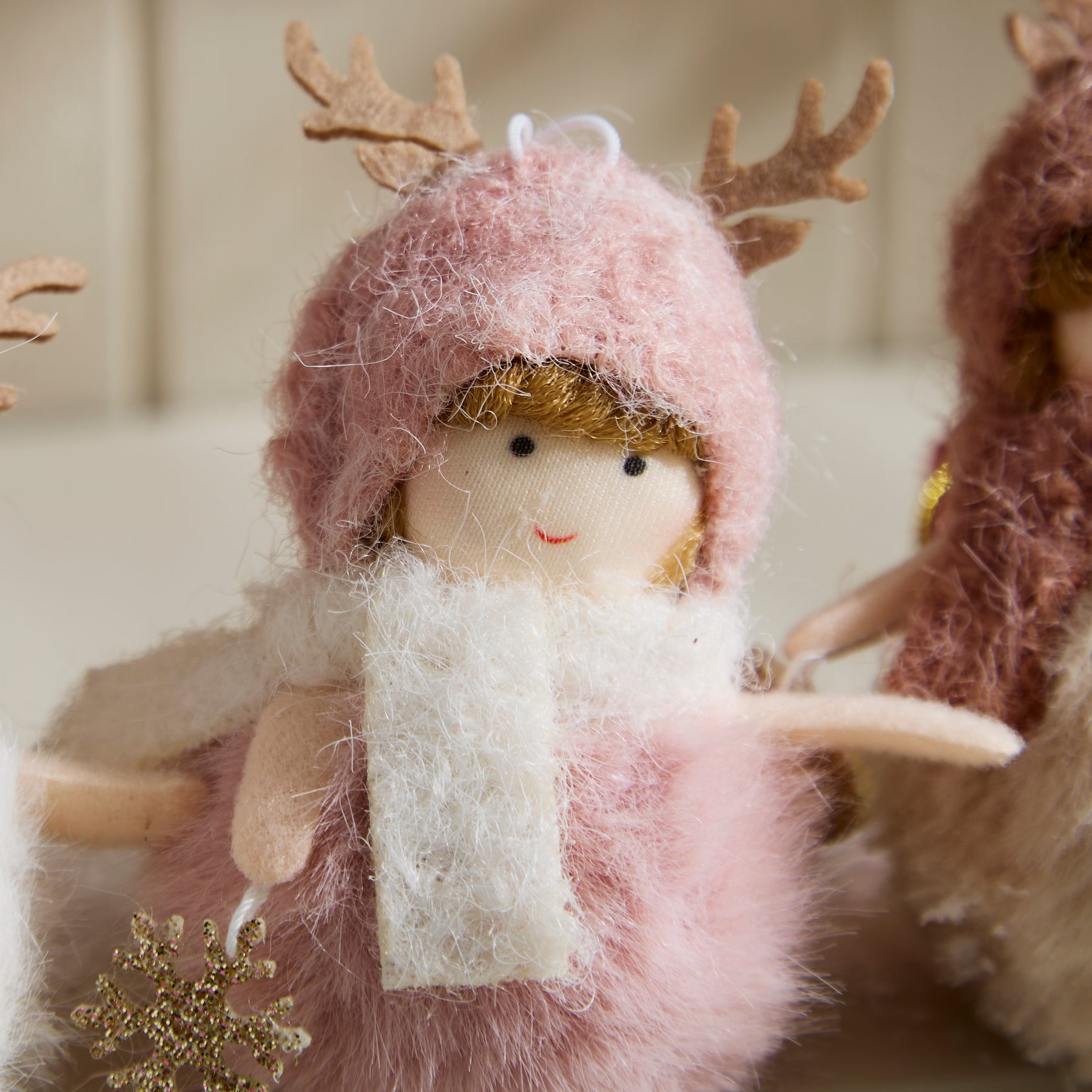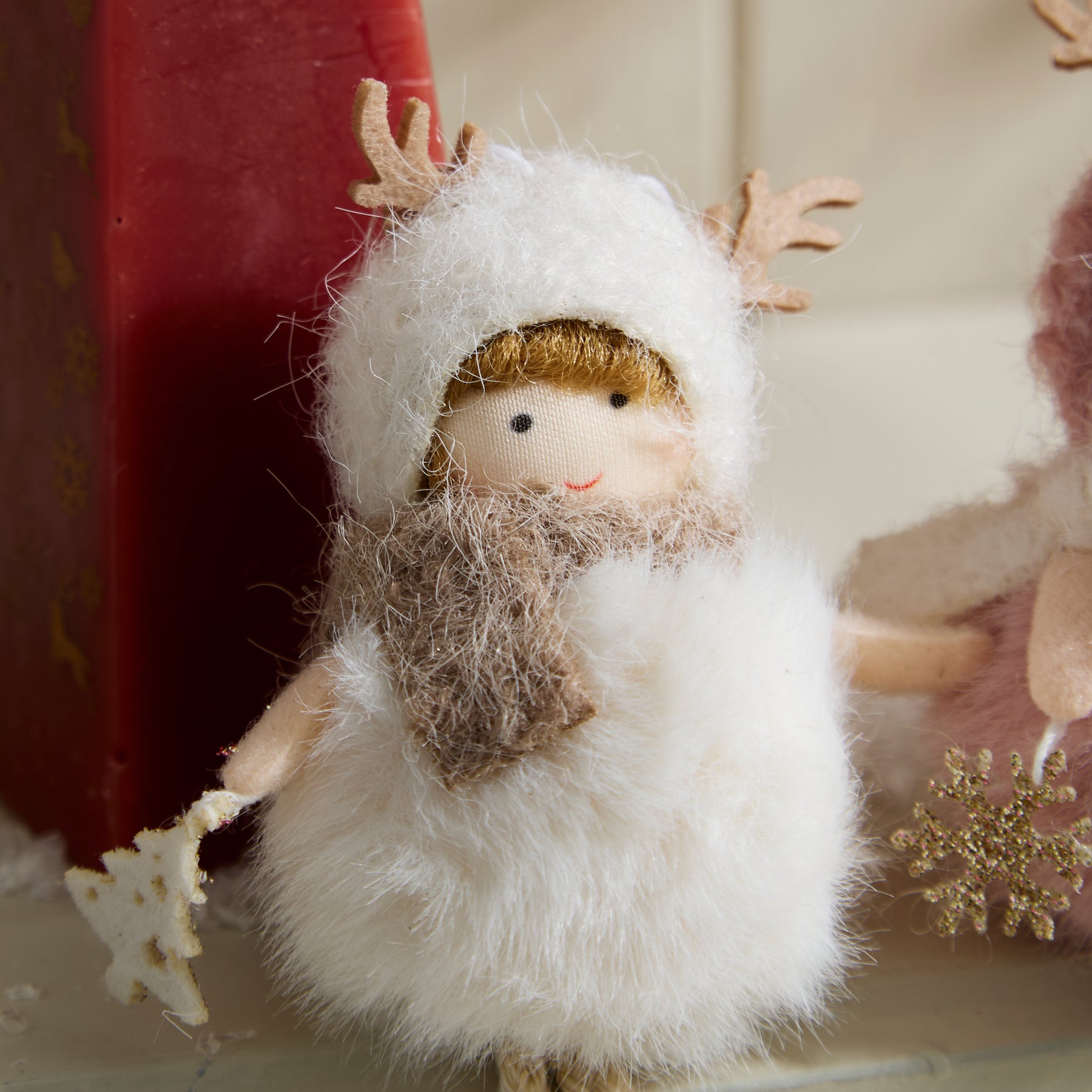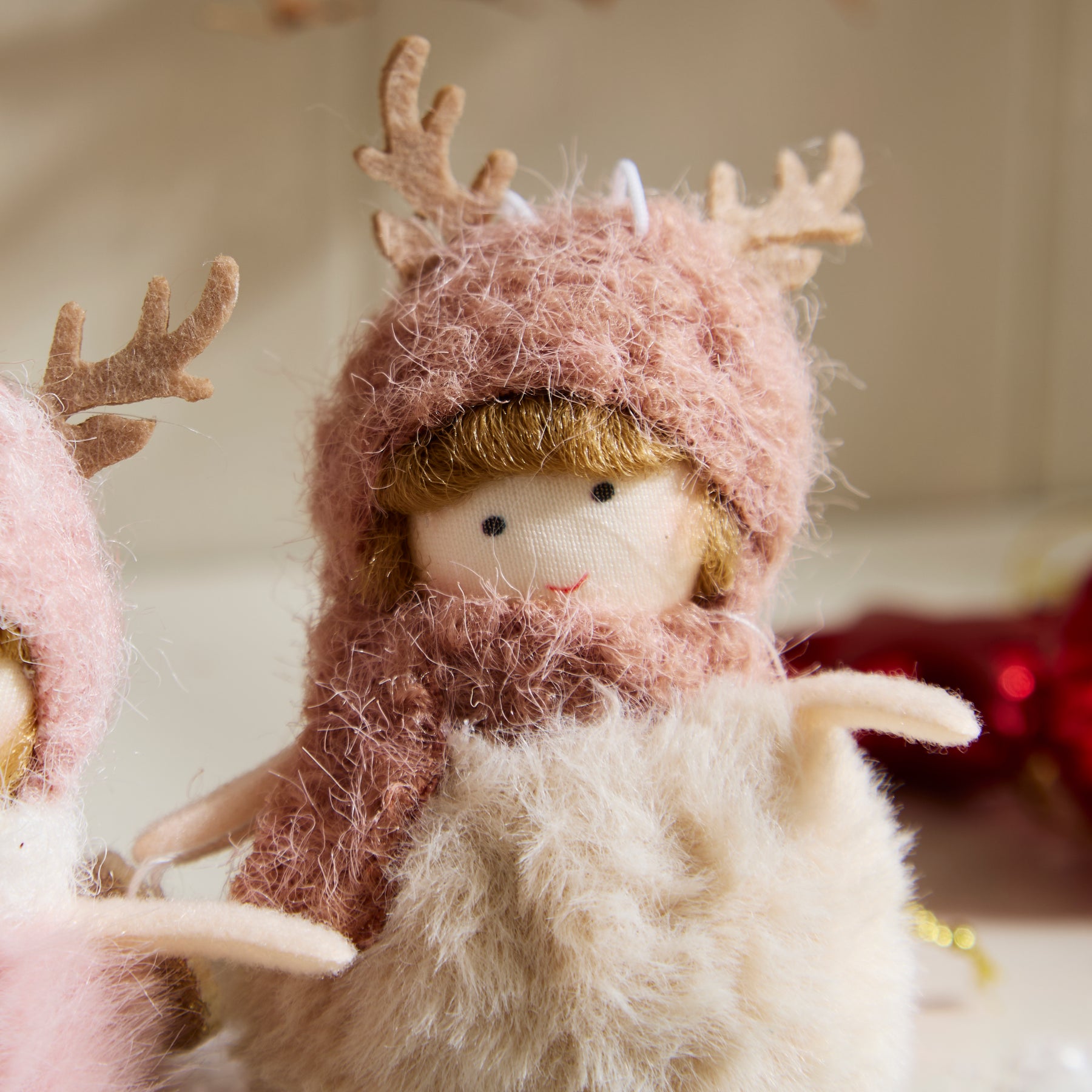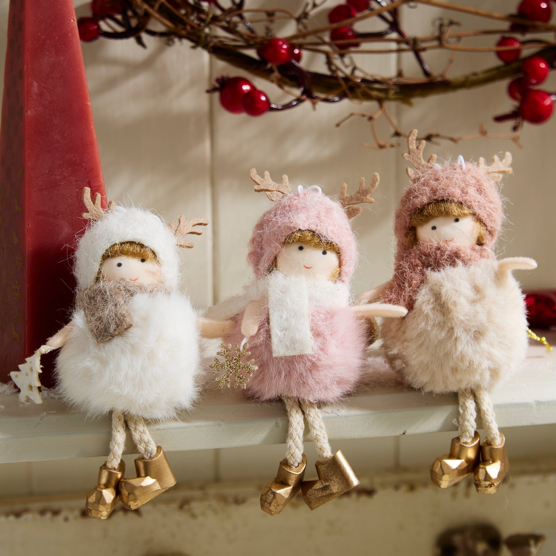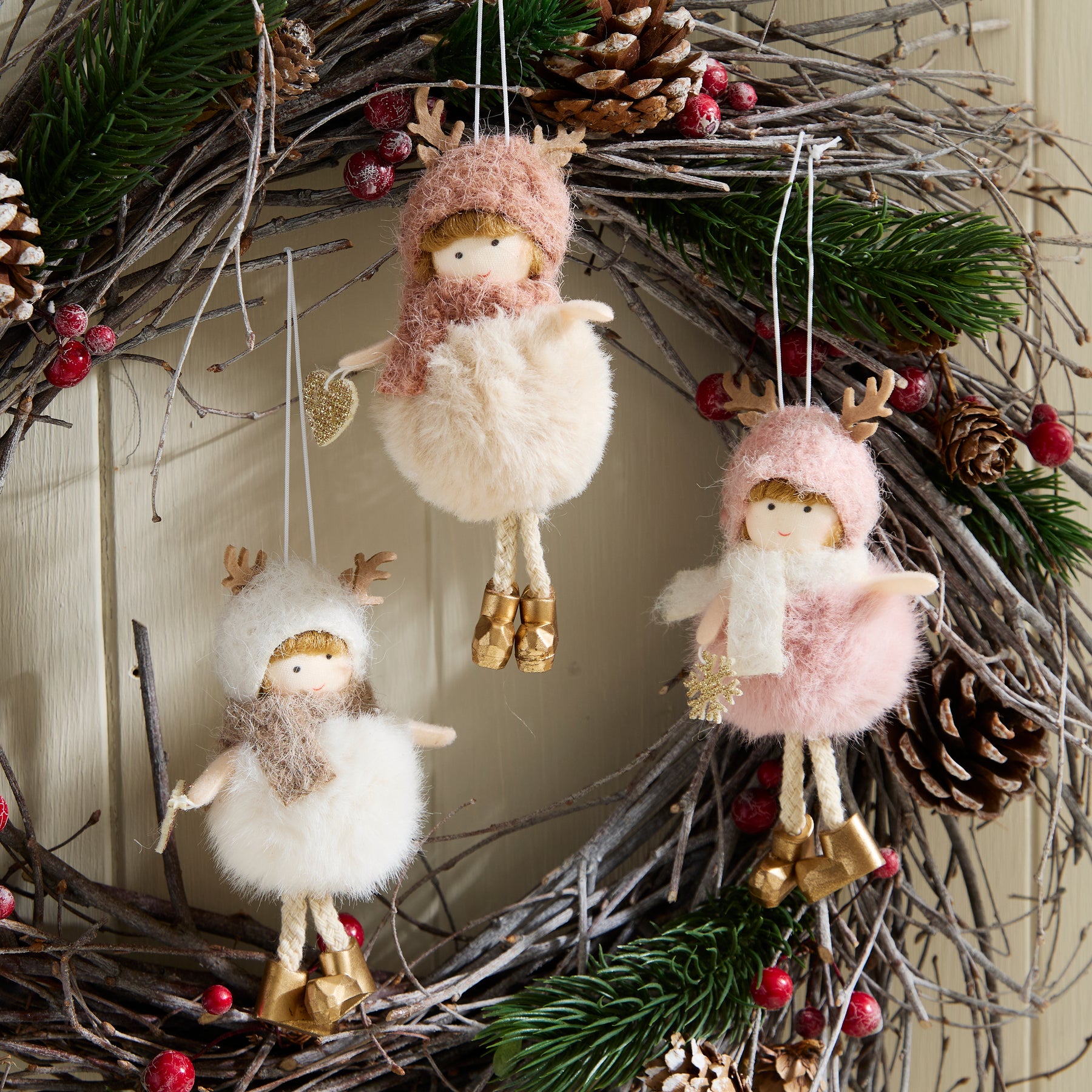 Add a touch of festive charm to your home with this delightful trio of Antler Girl Pompom hangers. Each features a fluffy pompom body, golden boots, glitter antlers, and a cosy winter outfit. Perfect for hanging on Christmas tree, walls, or Christmas displays. Sold as a set of three.