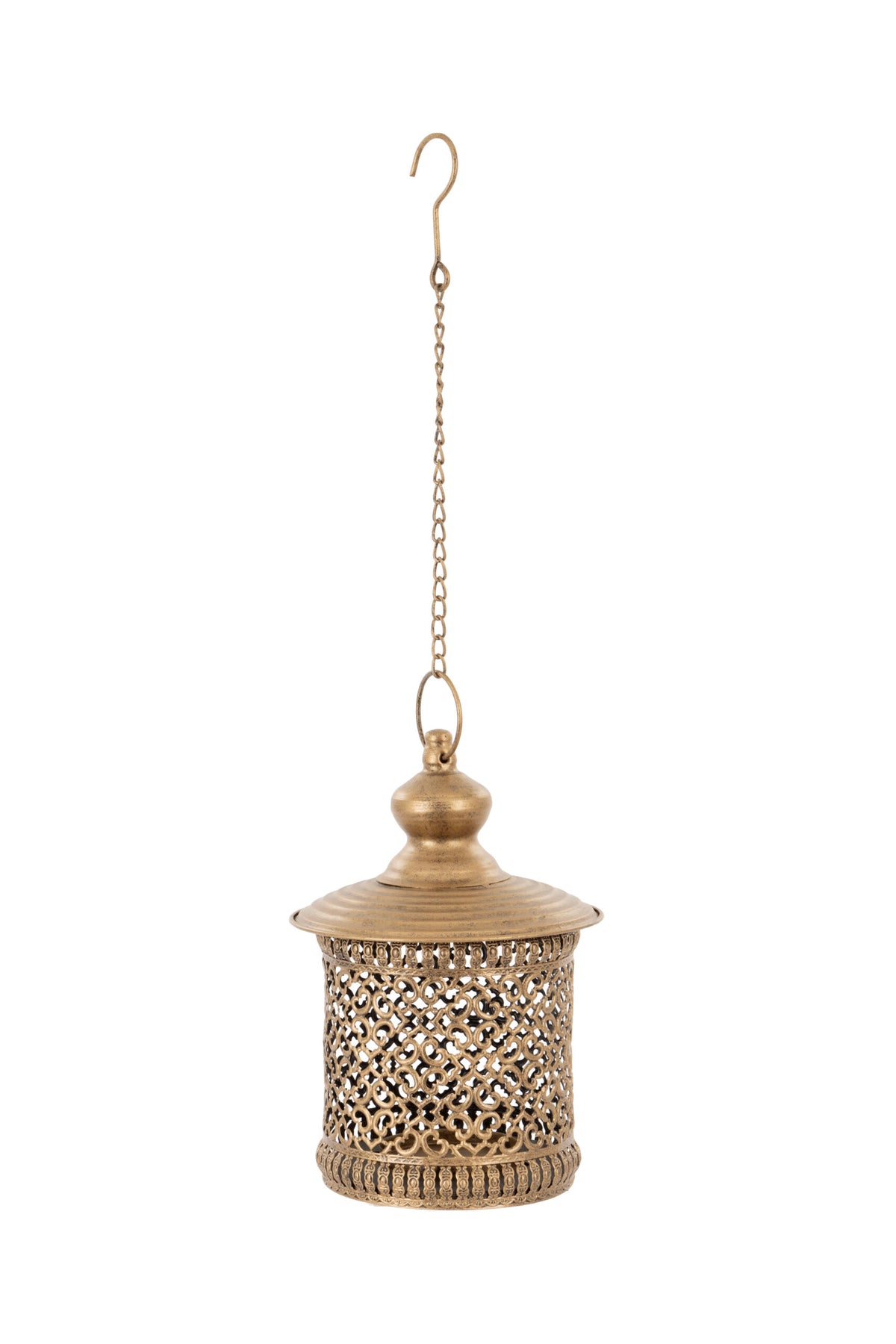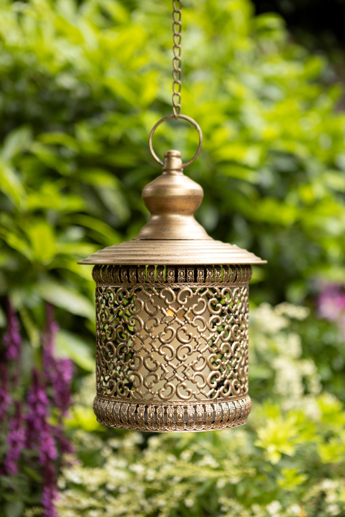 Add warmth and character to your home or garden with this vintage style gold coloured metal hanging lantern. With it's intricate cut-out design it creates beautiful patterned light when used with a candle or LED tealight. Complete with a coordinating hanging chain, it’s ideal for patios, pergolas, hallways or cosy living spaces. A timeless decorative piece designed to enhance both indoor and sheltered outdoor settings.