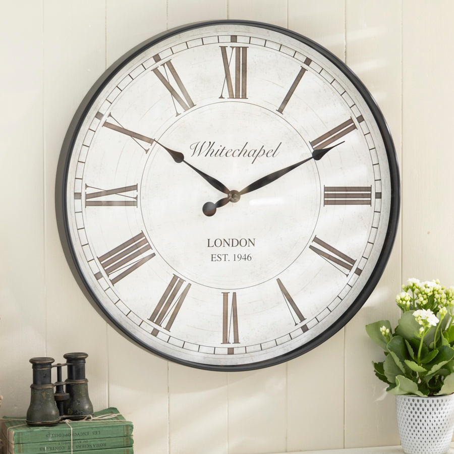 Add a touch of classic elegance to your space with this Vintage Whitechapel Wall Clock. Featuring bold Roman numerals, this clock evokes the charm of traditional British craftsmanship. The distressed white face and sleek black hands provide a striking contrast, making it an eye-catching centerpiece for any room. Perfect for vintage or shabby chic decor, this clock is both a functional timepiece and a stylish statement piece for your home.