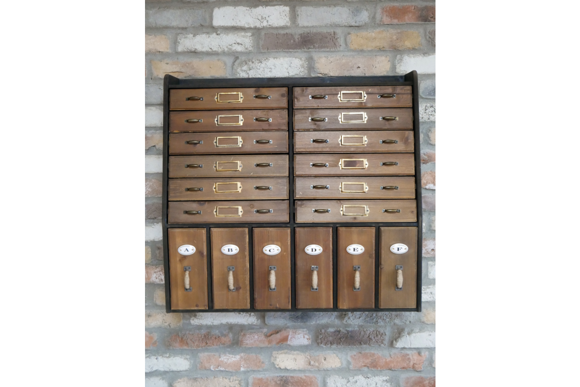 A vintage-style wooden drawer unit designed to bring organisation and rustic charm to any room. Featuring multiple drawers in two sizes, each drawer front is fitted with either a metal label holder or an alphabet plate for clear identification.