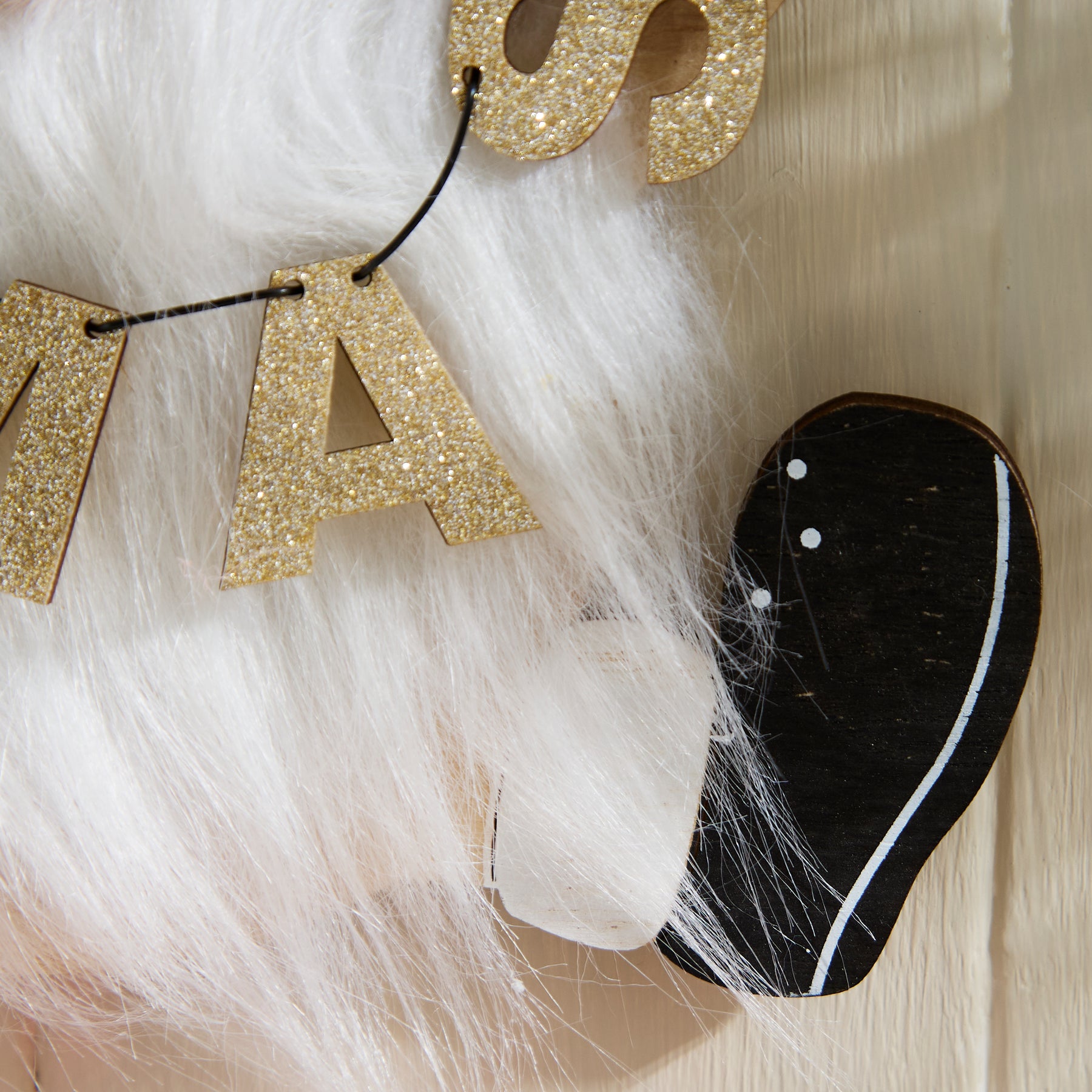 Add festive cheer to your home with this delightful wooden Christmas gonk decoration. Featuring a fluffy white beard, red striped hat, and glittery XMAS garland, this charming gonk is perfect for hanging on your tree, wall, or door. A fun and whimsical addition to your Christmas décor.