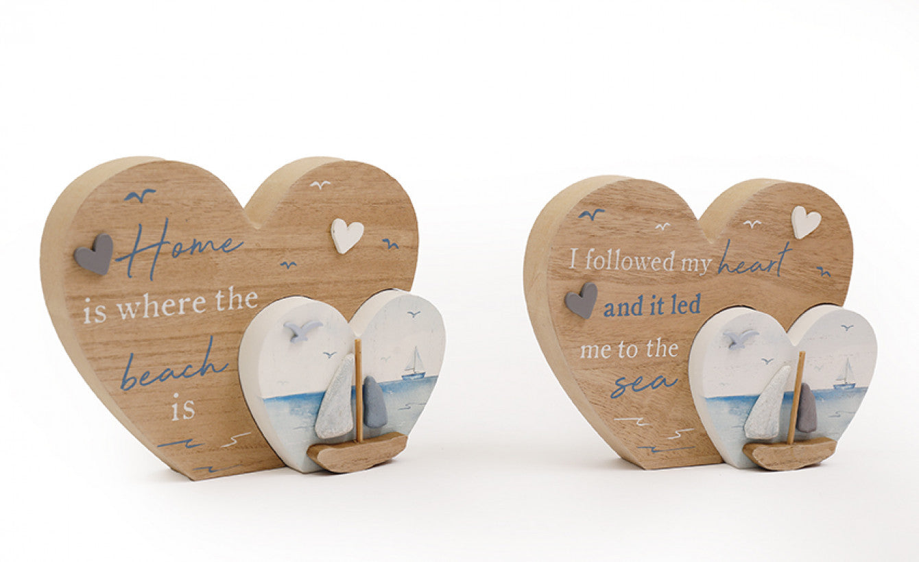 Add a touch of seaside charm with these freestanding wooden heart decorations, each featuring a mini sailboat, layered heart detailing, and a beach-themed quote. Choose from “Home is where the beach is” or “I followed my heart and it led me to the sea.” Perfect for shelves, windowsills, or nautical-themed décor. Sold individually.