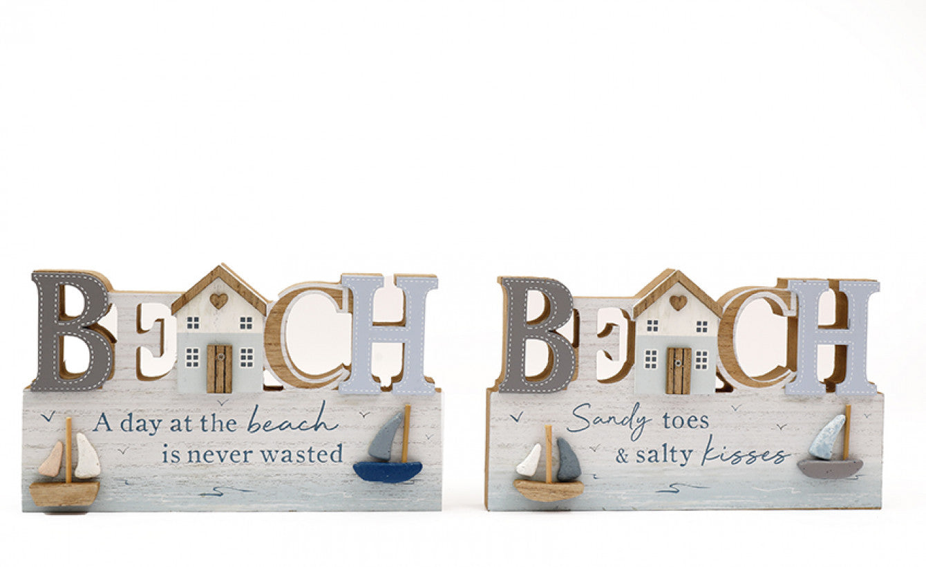 Bring coastal charm to your décor with these freestanding wooden BEACH signs, each featuring pastel-toned letters, a beach hut, mini sailboats, and seaside sayings. Choose from two uplifting quotes: "A day at the beach is never wasted" or "Sandy toes & salty kisses." Sold individually – perfect for shelves, windowsills, or summer displays.