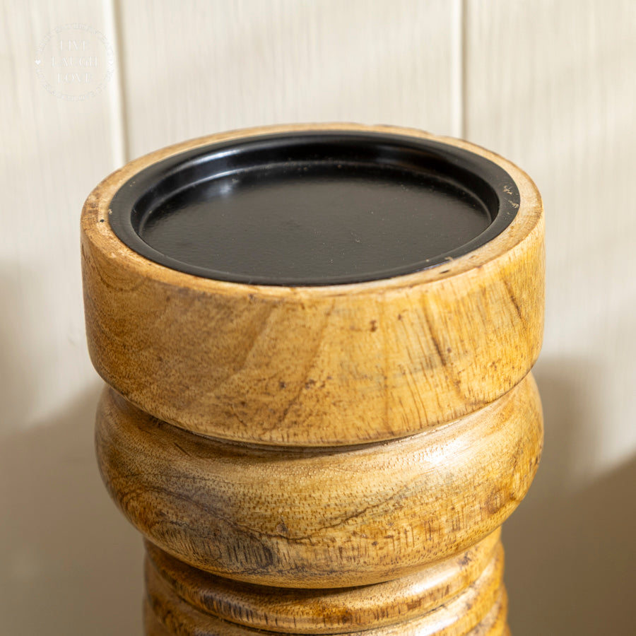 Add a touch of natural charm to your space with our Wooden Ribbed Candle Holders. Available individually in small, medium, or large sizes, or as a set of three assorted sizes, each holder is crafted from natural wood with a ribbed design and a black metal insert for a sturdy and stylish look. Perfect for creating a warm and inviting atmosphere in any room.